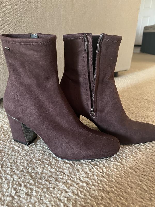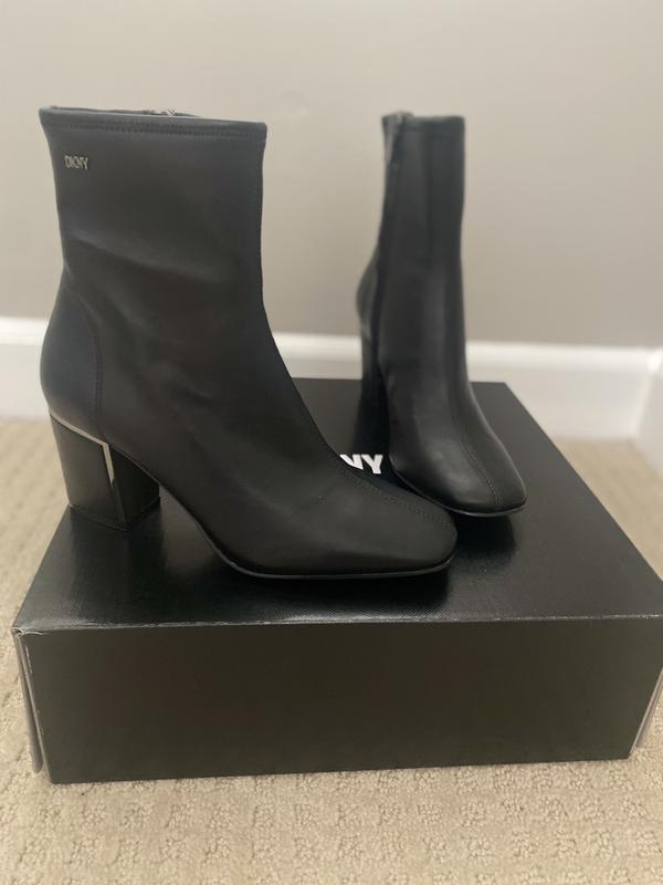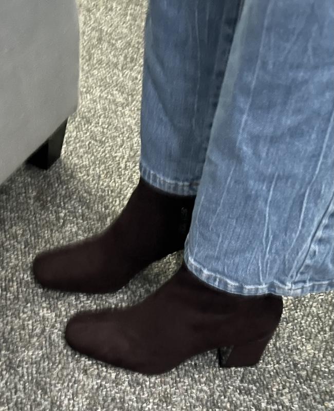 These are really cute ankle boots. They are a nice black color. The heel is pretty wide which I like. They are true to size. They are easy to put on and take off. These would look great with a skirt and sweater.