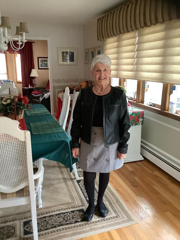 My mom, 80, wanted a leather jacket. She’s 126 lbs, 5'1", with a short waist. We ordered the large for her. She looked amazingly beautiful. She loved it. It fell just below her waist. Very fashionable. Well-made. She always needs to roll the sleeves. Too bad it’s not made in petites.