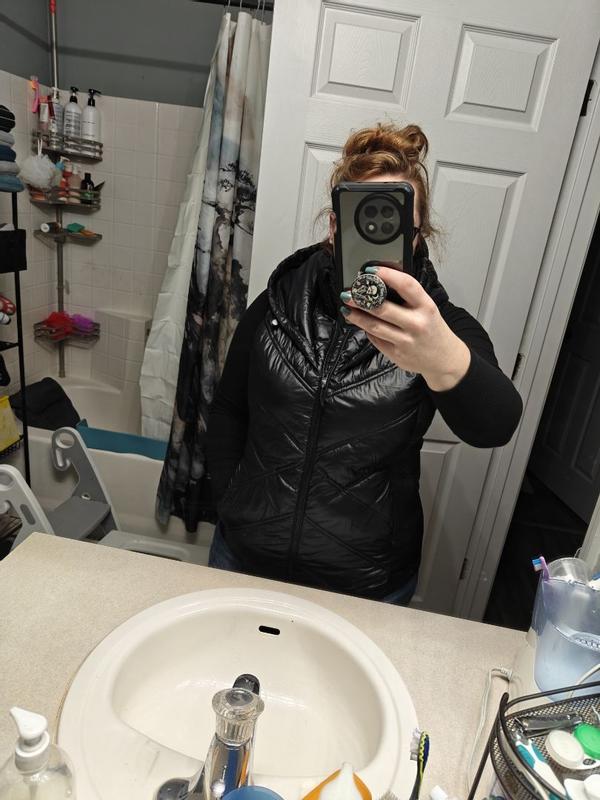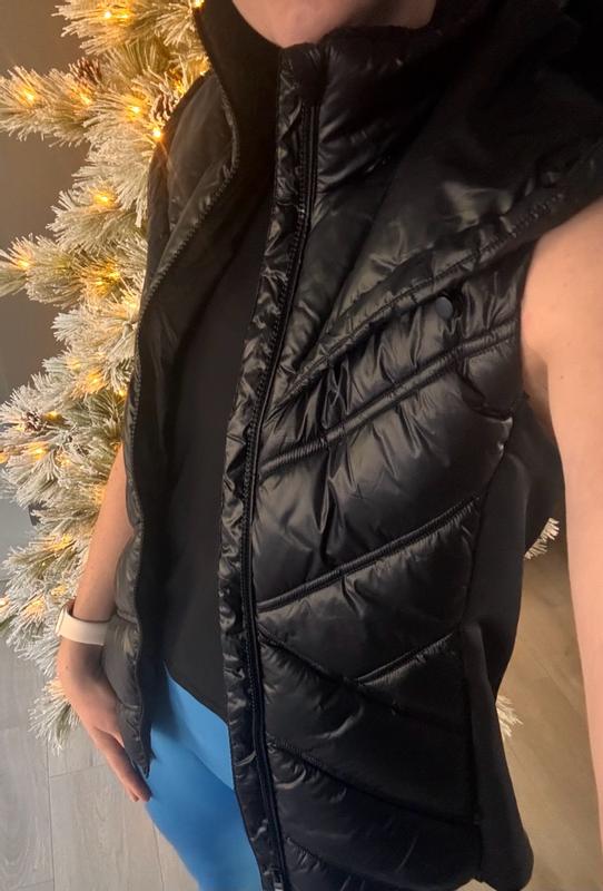 I really like the DKNY contrast collar hooded puffer vest. I usually wear it on cooler days as an additional layer. The vest is versatile, I can wear it with leggings and sweatshot, or with jeans and shirt/sweater. The quality of the materials is good, I like how DKNY mixed three material types to deliver warmth, and style. The zipper works well, and the vest has two pockets. The vest is true to size.