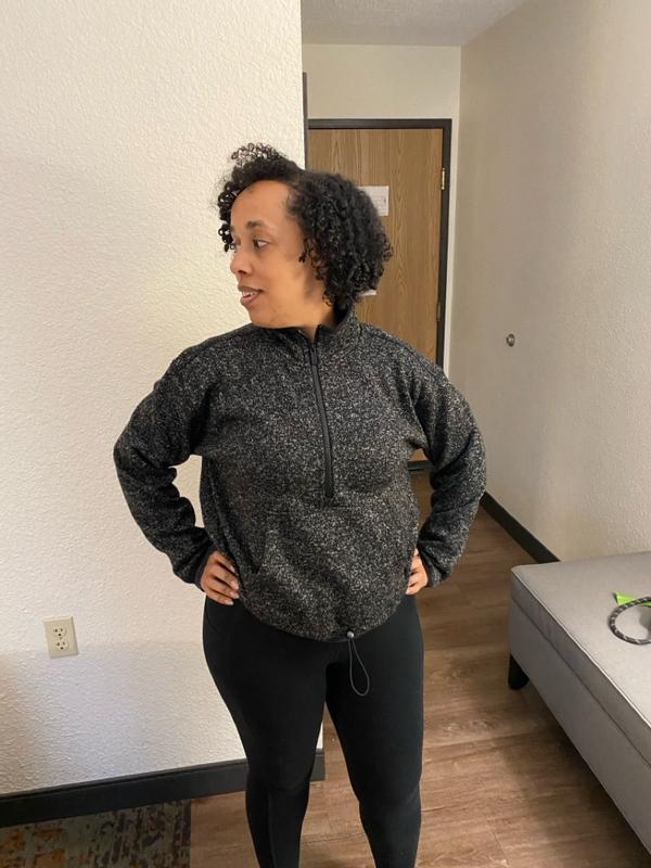 very cute style for a sweatshirt. love the color and perfect thickness. not to heavy. really like the bungee hem. makes shirt very flexible to wear.