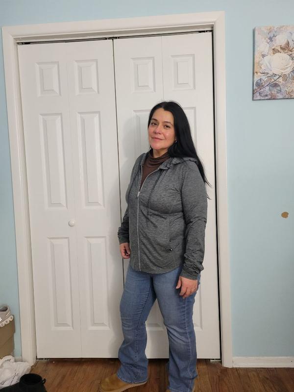 The spacedye fabric design is attractive and the neutral color goes with pretty much all active wear. The material is stretchy and form fitting on my hourglass figure. I love the detail on the cuff—the ruching is a great touch to add some interest. The zipper is thoughtfully done with an extra piece piece of rubber (or something to that effect) that makes it easy to feel and pull up or down. Love that it has a nice sleeve that lays pretty much flat on the back when not in use, and two pockets are nice on the front for small items. This is a nice option for adding an extra layer and warmth, while being on the thin side. I’m glad it’s not bulky! I think it’s a stylish piece of active wear and also easy to wash and care for.