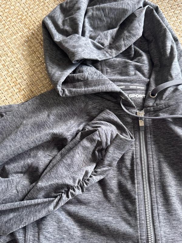The DKNY Spacedye Full Zip Hooded jacket is such a great quality hoodie! The material is top-notch and super comfortable. I especially love the fitted format and rouged sleeves! It definitely adds a modern touch to the jacket. This hoodie seems wonderful to wear just about anywhere as it allows easy movement and isn't too constricting. The zipper is a sturdy, secure zip that seems very durable. I was pleasantly surprised to see that the strings had a rubber/plastic security to protect it from fraying. I believe I will be repurchasing this style hoodie in other colors because it was designed to last! I can't wait to recommend it to others!