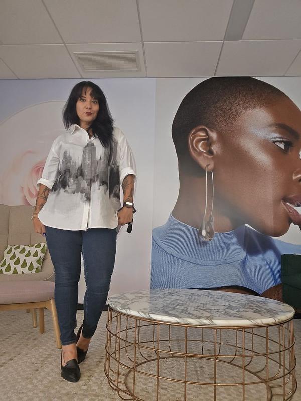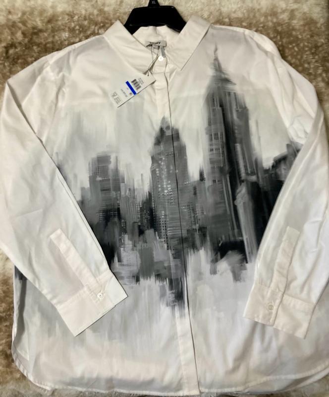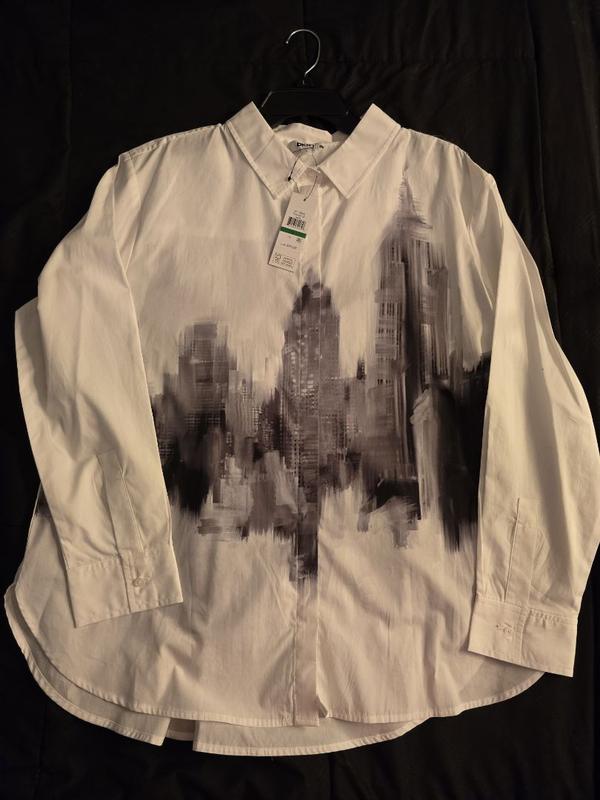 This blouse is an Oxford style button up top. It has a hazy, misty, modern image city scape . It fits nicely but I do feel it’s on the larger size. It goes well with black leggings and I liked to pair it with leather look leggings. It’s a nice sophisticated look that can be casual wear or a more dressed up look.