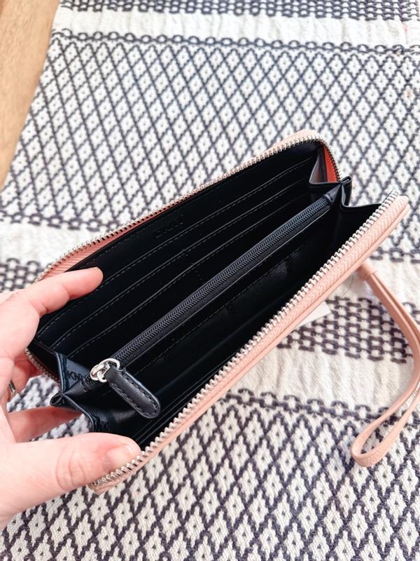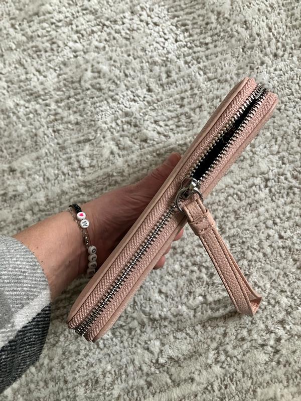 Love this bag for so many reasons. It had a great wrist strap that allows me to carry it for quick errands, it has a beautiful pink color, high quality zipper, and plenty of room inside for cash, cards, and coins.