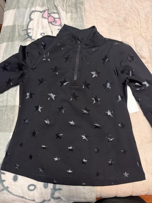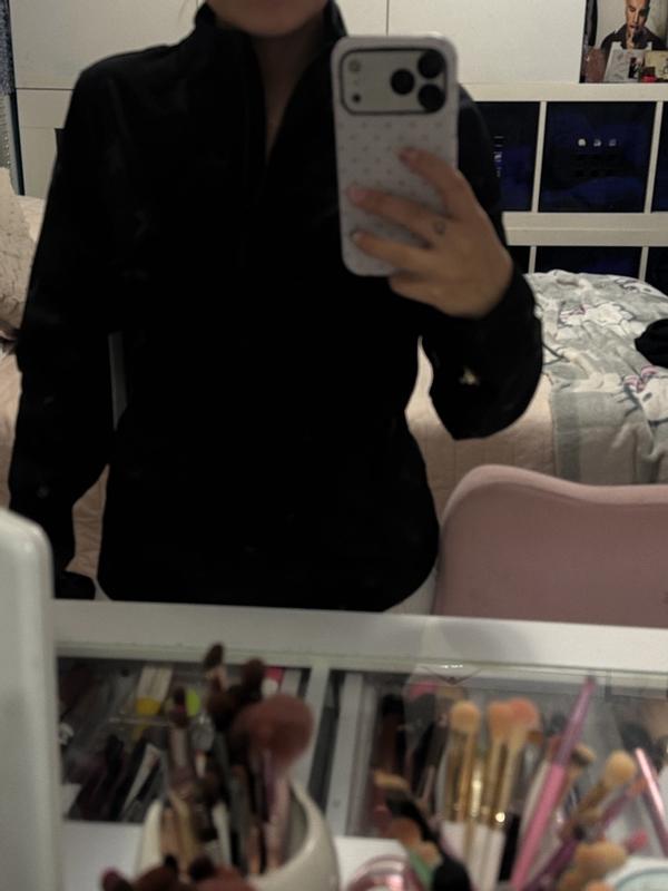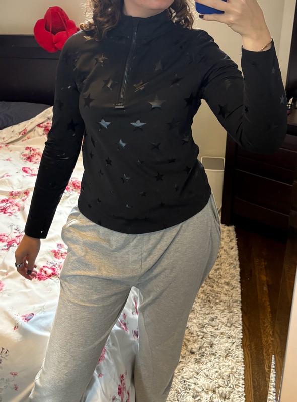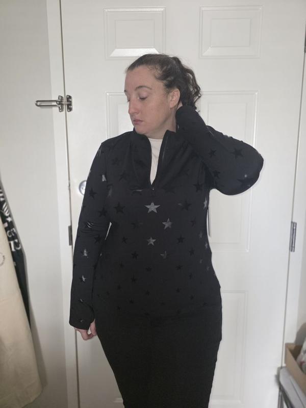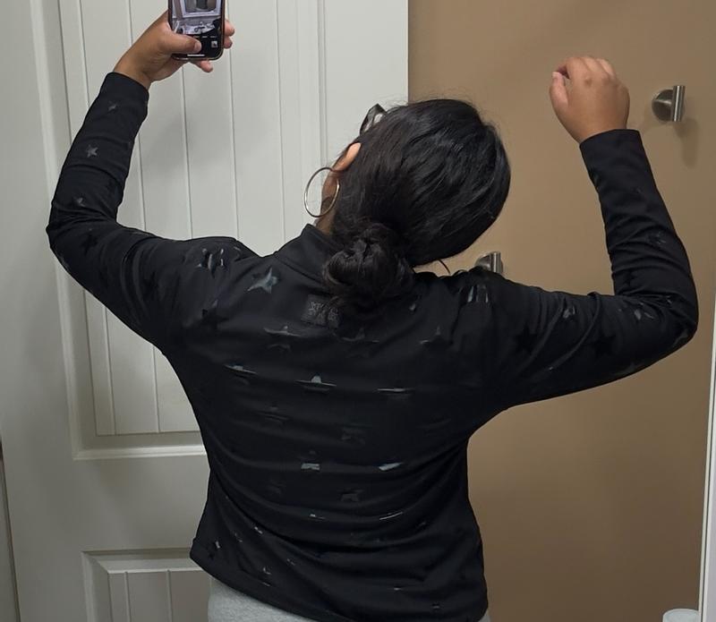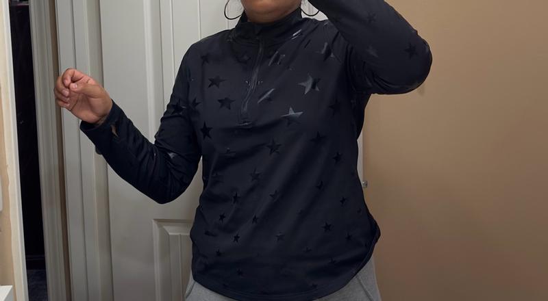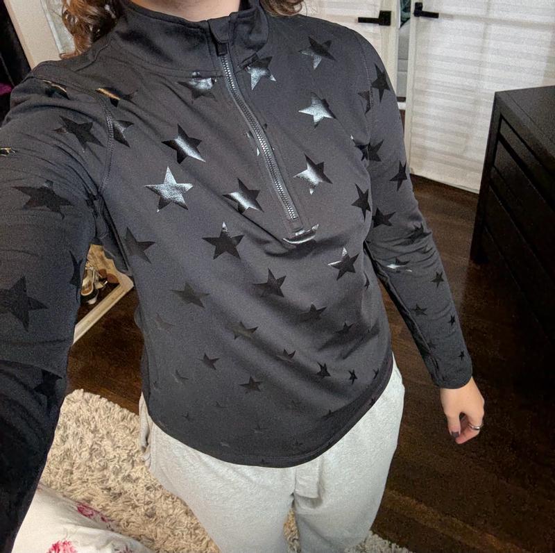 I love the fit of it. It has these curves on the sides that make my body look great. It’s super stretchy, super warm and the holes on the fingers are a plus. I also love that it has that half zip. It’s totally black and the stars are glossy which make it pop a bit. It has a tag on the back almost unnoticeable and the inside fabric is soft and makes it super warm without having to bring a big and thick jacket. I did stretch it out to see if the start cracked but they didn’t, it looks durable and has great quality fabric. Super breathable and nice fit. If you go to the gym, hiking or just out it makes a great match to any outdoor sport outfit.