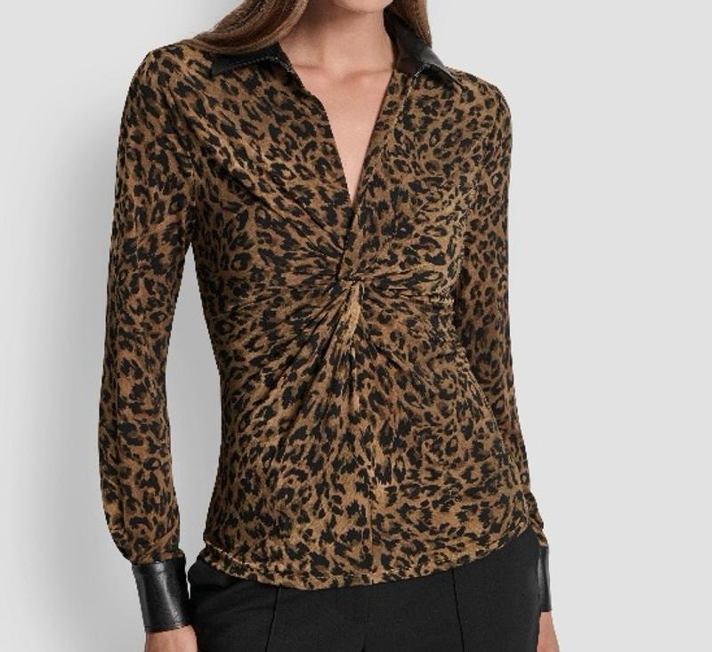 I was looking forward to getting this blouse. It looked on trend, the faux leather collar and cuffs gave it an edgy look and the pictures looked exactly like what I was looking for, it fit perfectly but the color was just too dark, not attractive. I wish the print was brighter and more defined. I returned it.