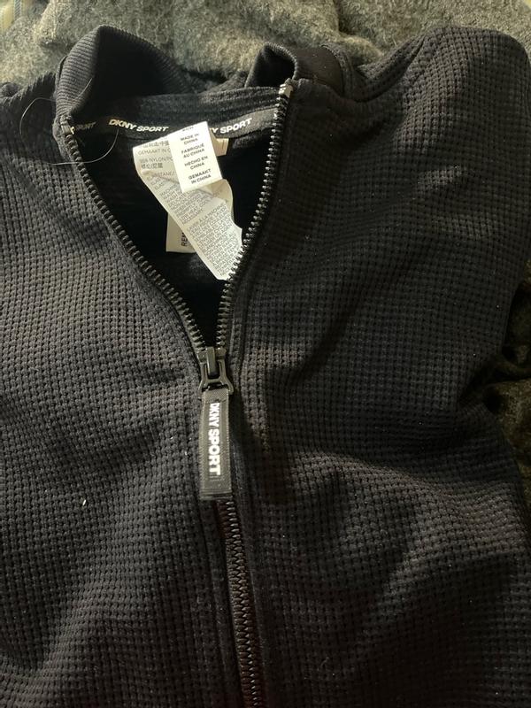 Zip up hoodie . Fits really nice . Great material . Has stretch to it. Dkny brand . Can be wore casual or more dressed up . Easy to wash . Keeps you warm . Nice size hood . Very trendy look .