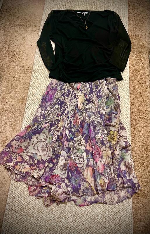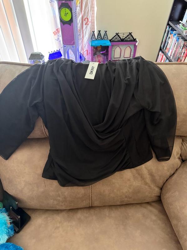 It’s a nice special occasion/date night top. Because it’s fitted, it looks nice with a sheer, layered flowy skirt, but it also paired well with nice jeans and boots. The ruching is flattering, and it’s a little sexy, but definitely not over the top. I’m usually a 12, and the L fit well. DKNY is well made and classic in style, but still affordable.