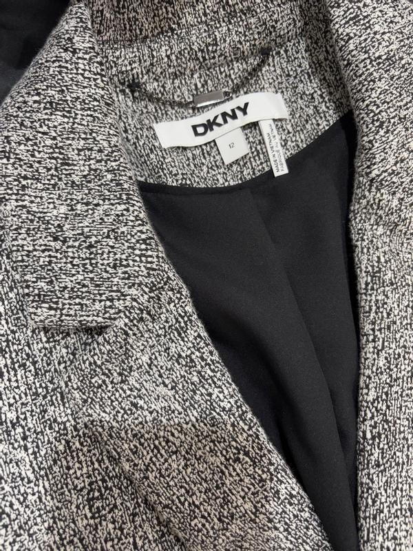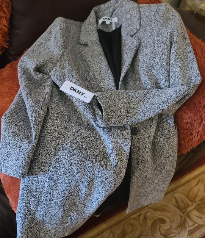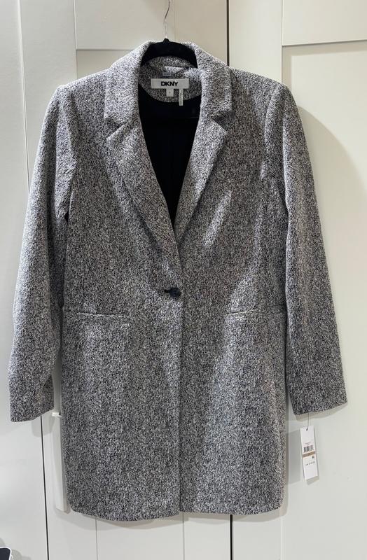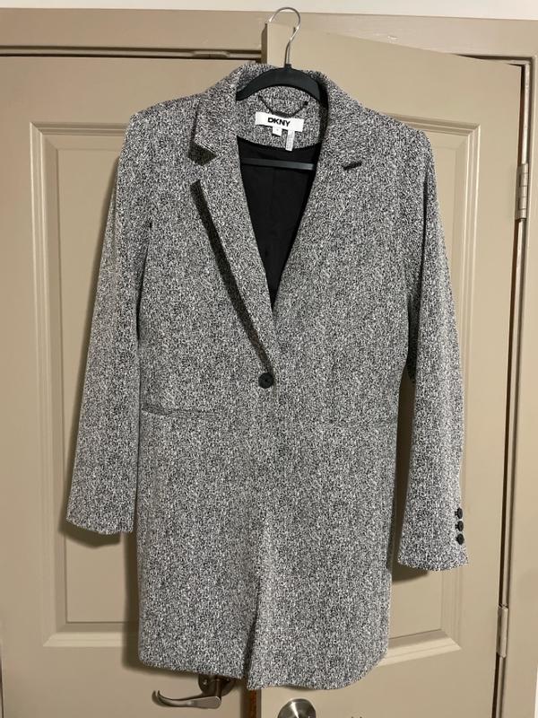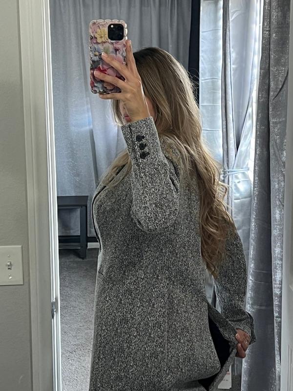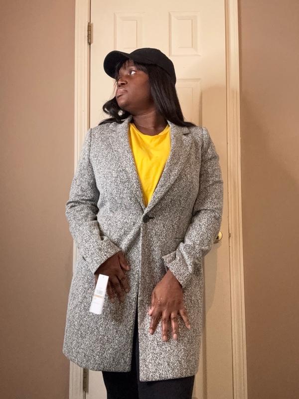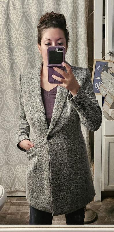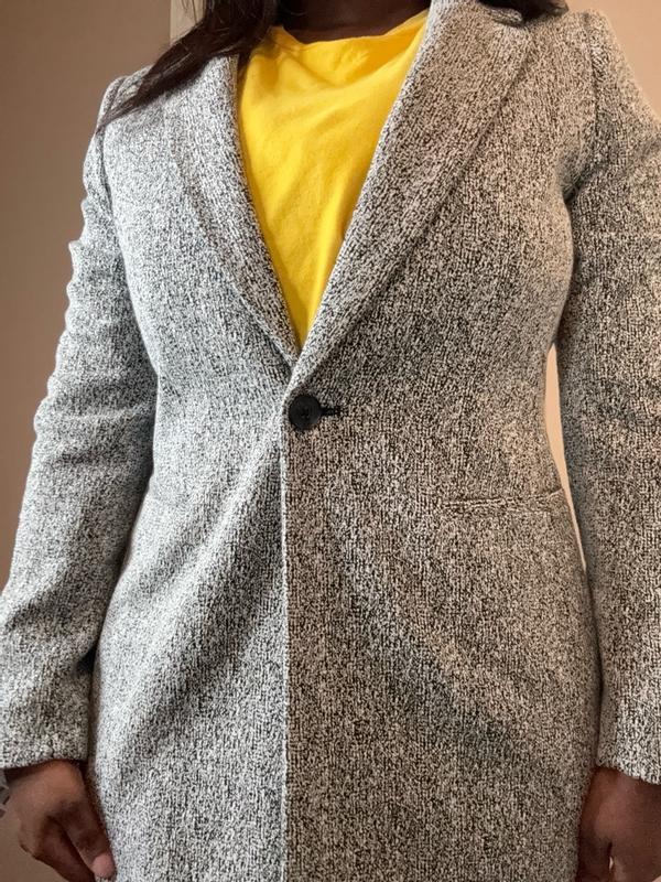 Tailored lightweight trans-season coat. Slim fit. Black/white tweed. Overall appearance is light gray. Well made. Button and pockets sit at high waist. Awkward pocket placement is impractical. I am 5'3', 105#. Size petite 2 fits well.