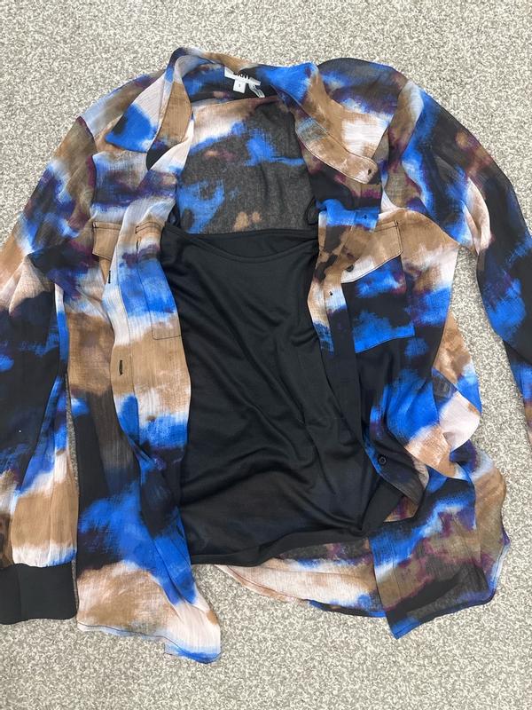 The blouse is beautiful with bright colors. It makes the print stand out boldly. It has a cami which is perfect since it is see through. I do hang dry so there was no shrinkage when washing.