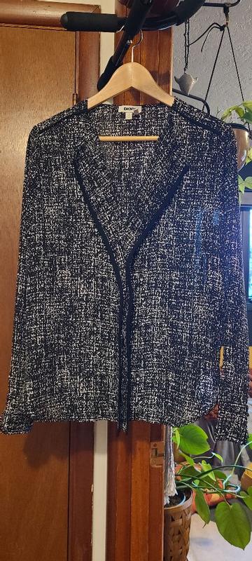 This DKNY blouse looks so elegant and stylish! The lightweight, airy fabric drapes beautifully and feels soft on the skin. The contrast piping highlights the neckline and adds a neat, sophisticated touch. It’s a perfect piece for both the office and going out — versatile and comfortable!