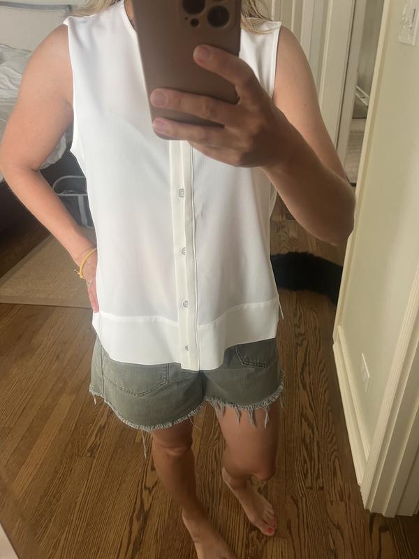 I am in love with this beautiful button front top by DKNY. It is round neck and sleeveless. The top looks adorable with jeans or skirts. The fabric is high quality and very comfortable. I have received many compliments for it.