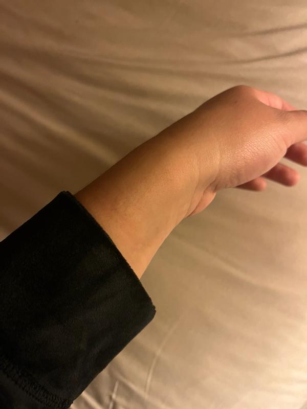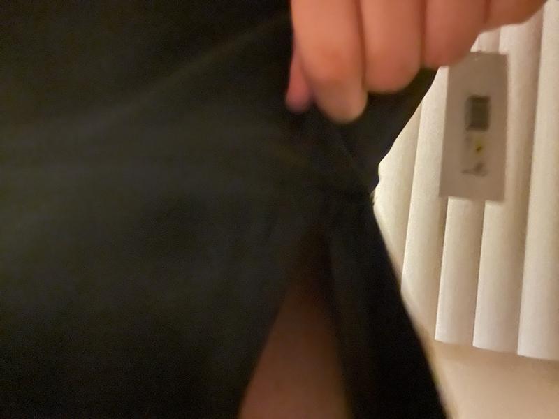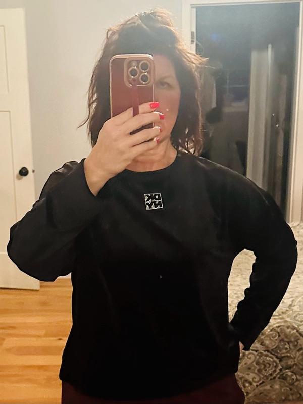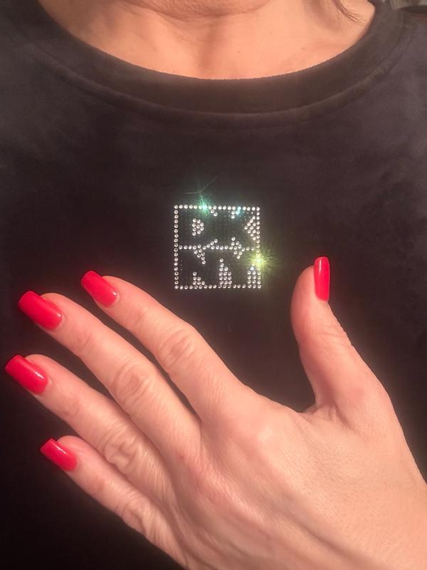 This black velour top is so soft as velour should be. The DKNY rhinestone emblem is sparkly and gorgeous! I asked for a large hoping it would be a bit baggy and it definitely is and the arms are plenty long so if you want it less baggy, size down. It is plenty long, sits right below the waist and is easy to tuck. It does also have some stretch to it. I did not have any shrinkage after washing in cold water and it kept its shape just fine. The only reason I gave it 4 stars is because the inside is not as comfortable, I just don’t like the feeling of the opposite side of velour right up next to my skin. I like it better if I wear a shirt underneath which is ok on a colder day. Gorgeous black color and would be fun for holiday!