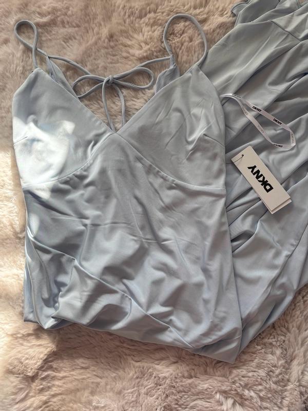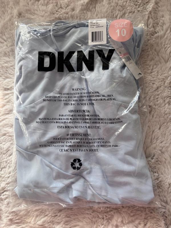 I bought this Light Blue DKNY on LAST ACT. It’s true to size. It’s very Soft and machine washable. I always like to hand wash and air dry. I’m a Size 8 and small busted. There’s not a lot of Material if you’re large on top. The hem has pieces of material that hang. I’m 5”5 and without 3 inch heels, I’m afraid I’d trip over part of the Dress. I’ll definitely need to wear shape wear to hold in my tummy. It’s very fitted but, has stretch and then flairs at the hips. Very Feminine and would be perfect for Summer Wedding or Cruise Dinner Dress. Doesn’t wrinkle at all!! I’m so glad I took the chance. It’s a Dress that isn’t too trendy that it will go out of Fashion. Great Find !!!
