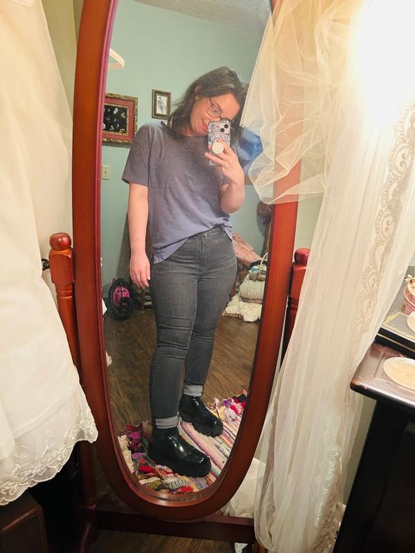 The bottom of this shoe is very stiff so it is not the most comfortable. Very hard on the bottom and tight around the lace part of your foot. It is very chic and the material is very sturdy. If you are a fan of doc martens and want something more girly and blingy then this is a good option but heel comfort beware!