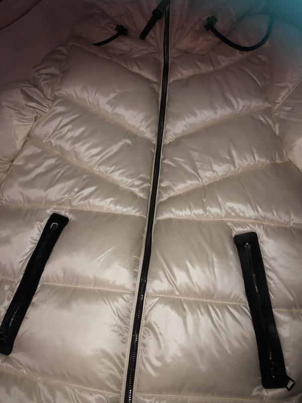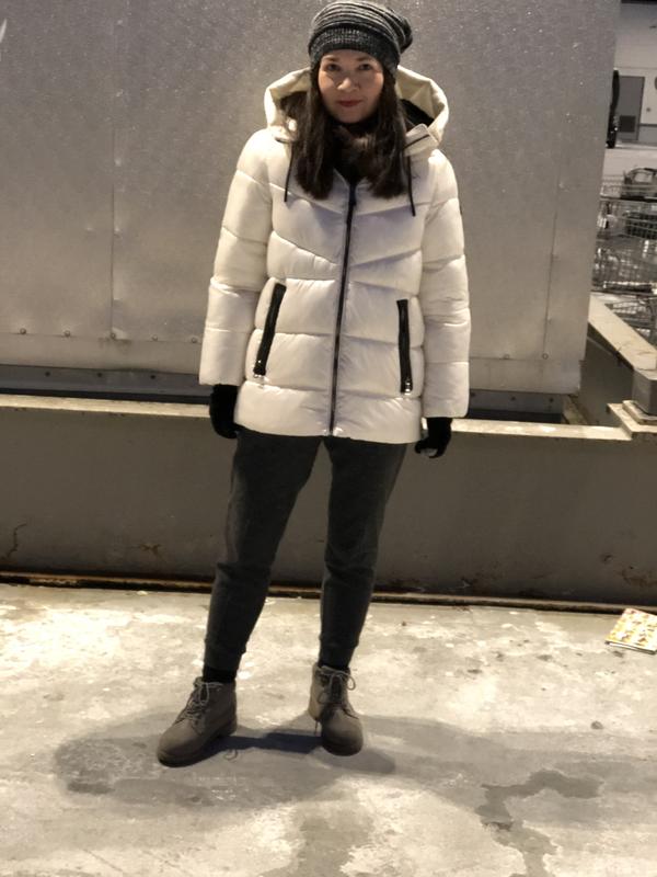 I usually wear size M in tops and jackets. I had to size down to S and I could still fit a sweater underneath. I could get away with wearing M but I wanted a more fitted look. The pretty Pearl color is a warm white with a soft satin shine. It did not keep me warm in 20ºF, my chest around the zipper area felt cold. But warm enough for 32ºF with a sweater. Very comfortable jacket, easy to move around in, light in weight, breathable, does not overheat when indoors. The tags say it’s water resistant and the insulation is made from recycled plastic bottles. Hood is non-detachable, sits high but can be folded down like in the product photos. The hood is the only part of the jacket which is lined with faux fur. Overall it’s a nice jacket.