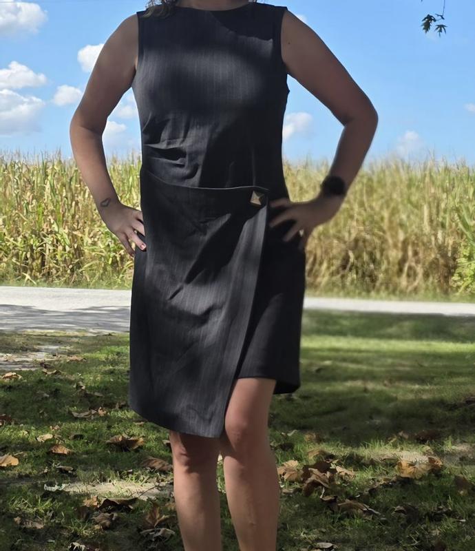 This is a great sassy dress for work. I love the wrap element to minimize a tummy. It’s very flattering. The pinstripe is a classic to keep in your wardrobe. It has some stretch and very comfortable. I would definitely recommend. Fits true to size.