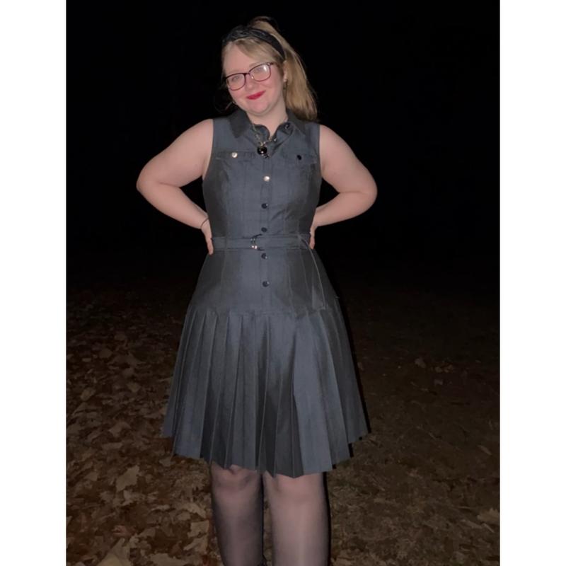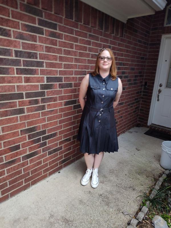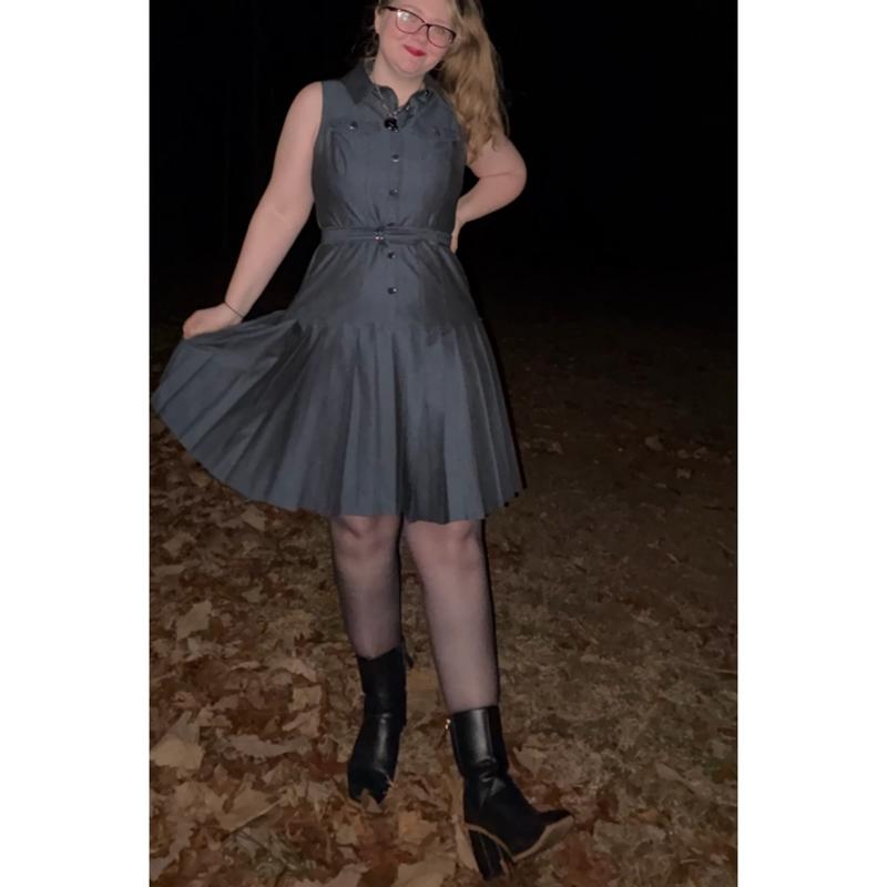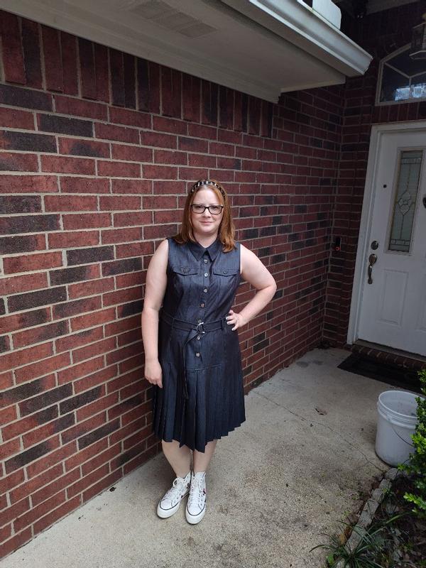 I think it fits true to size. I am on the smaller side of a size 14 maybe a 13 and I have a little room. I think this dress has a nice slimming effect on me. I love the belt, button front and collar. It has a nice dark denim color and it isn't too thick or heavy. I am in Texas and it will be cool all summer long. I also really appreciate that the vibe isn't too country. Instead it feels fun and sporty. Somehow it's both dressy and casual at the same time. I could run errands, go out to lunch or a date, attend a meeting, or hike through the trails and all would feel appropriate. Just changing my shoes and accessories makes it work for everything. My favorite part is the pleated skirt. It feels so nice and looks structured so it sits just perfectly right. My inner child just wants to spin and spin when I put it on. The quality is excellent. The stitches, hems and cut are on point. The only thing I would change is adding sleeves, I think cuffed right above the elbow or even fluttery short sleeves would make me feel better. The sleeveless cut makes my larger arms stand out. I can forgive it since I can wear it with different shirts underneath or jackets. But, I would have preferred sleeves. Then most importantly it needs pockets. I was truly shocked and upset when I realized there wasn't any pockets. The quality feels so nice that it didn't even occur to me they would skip out on them. I am still flabbergasted. I deserve pockets!