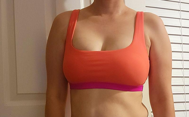 I got this DKNY square neckline colorblock bikini top and firstly, let me tell you how cute it was! I love the orange and pink together. It was bright and adorable for the Summer. The material is so soft and high quality. It was true to size and fit comfortably. I love it!