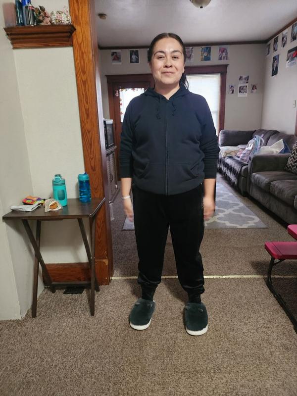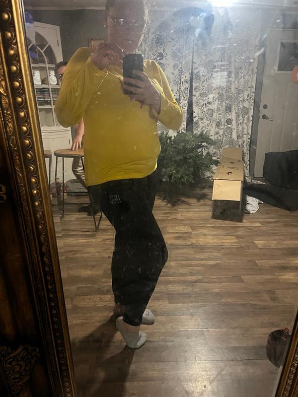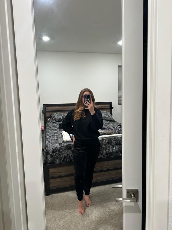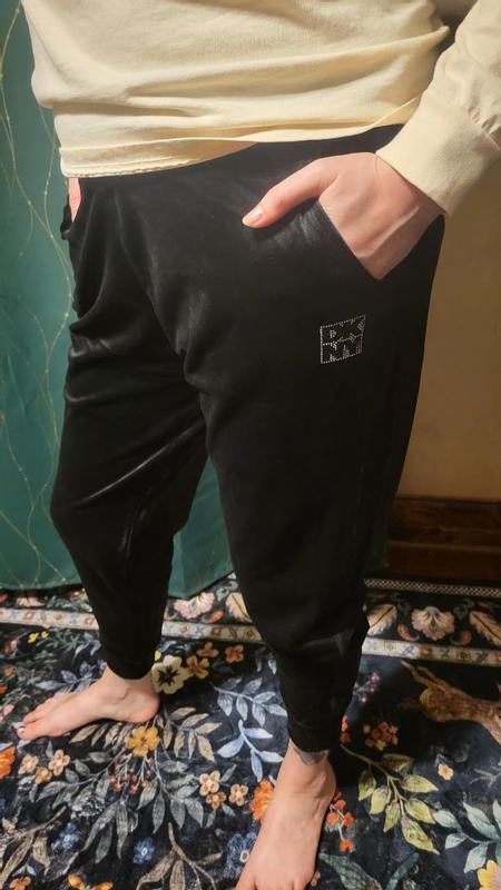 I bought these velour black pants because I thought they looked so sweet. I just received them yesterday and love them. They are so soft and more of a charcoal black not a dark black. I am 5’4 128 and the extra small fits perfect. I don’t like them super baggy. If you’re on the fence, go get them. You will love them… so comfortable to lounge in as well.