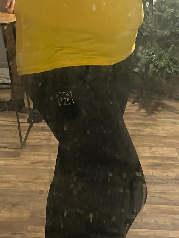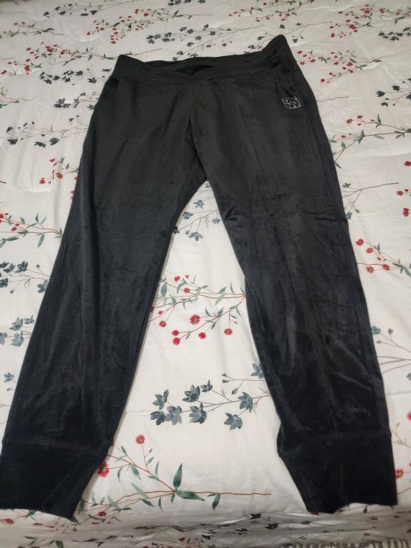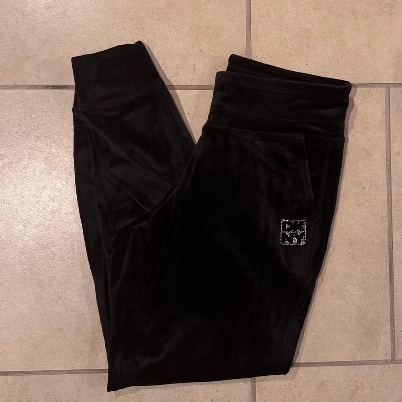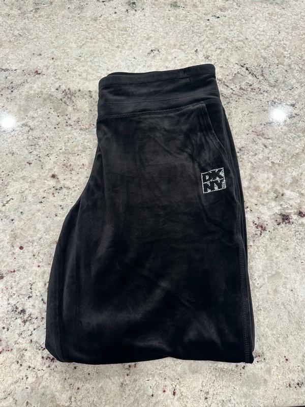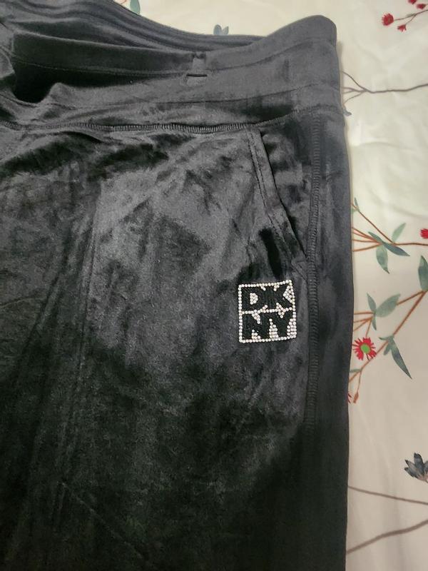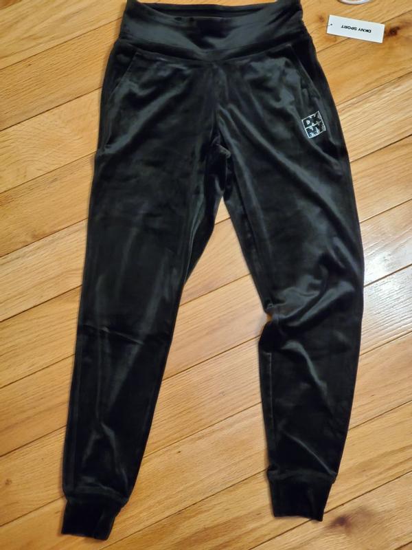 Love these Velour Joggers. They stand true to their name Super Soft! They have deep pockets and a wide waist band. They are low rise but not to extreme. Super cozy! Shiny black with a cute DKNY rhinestone design on left front pocket.