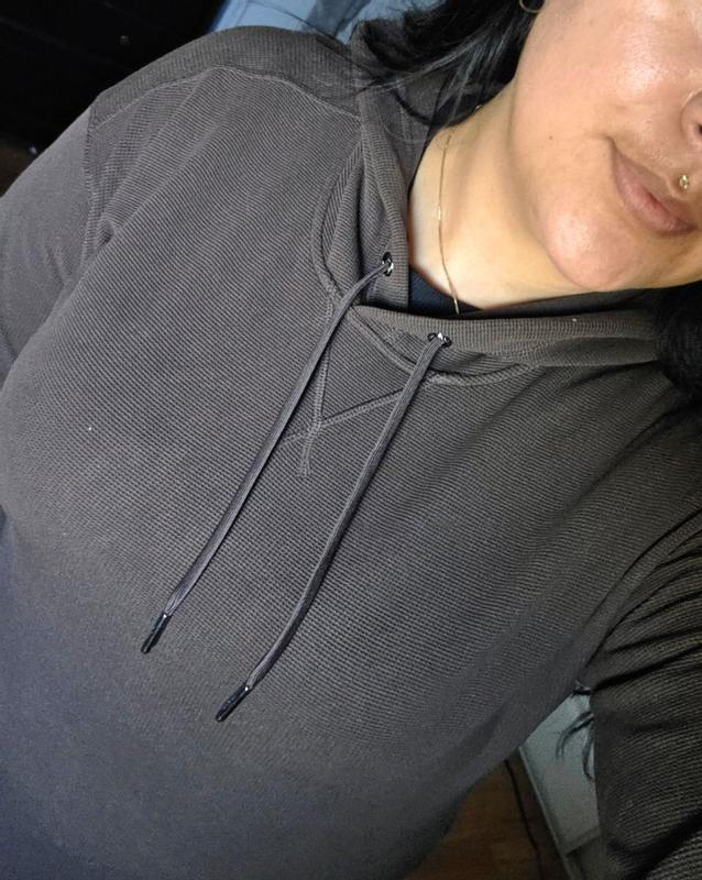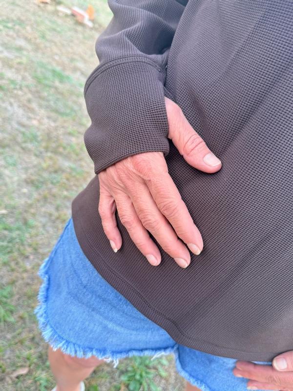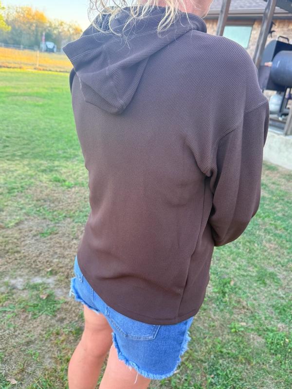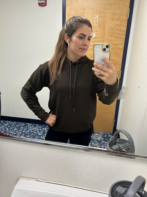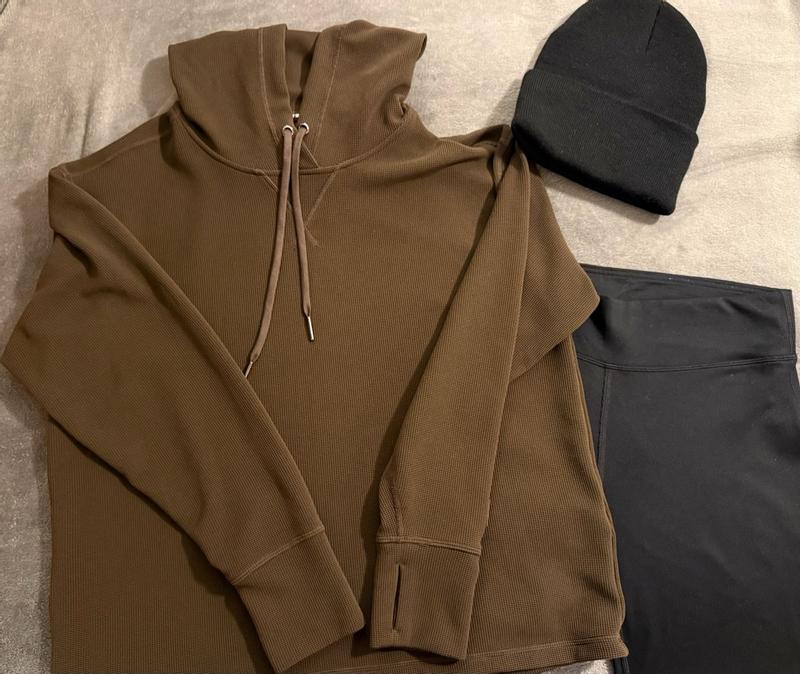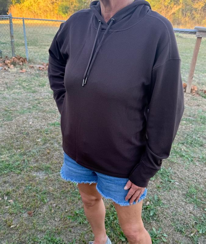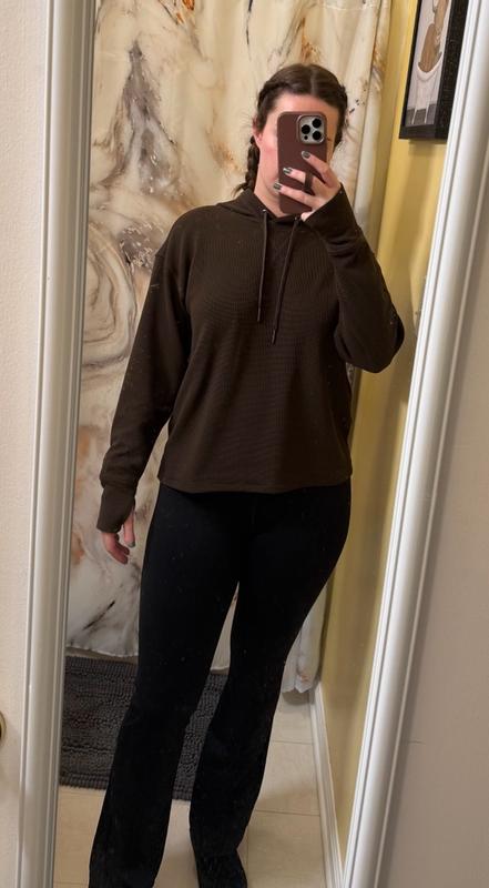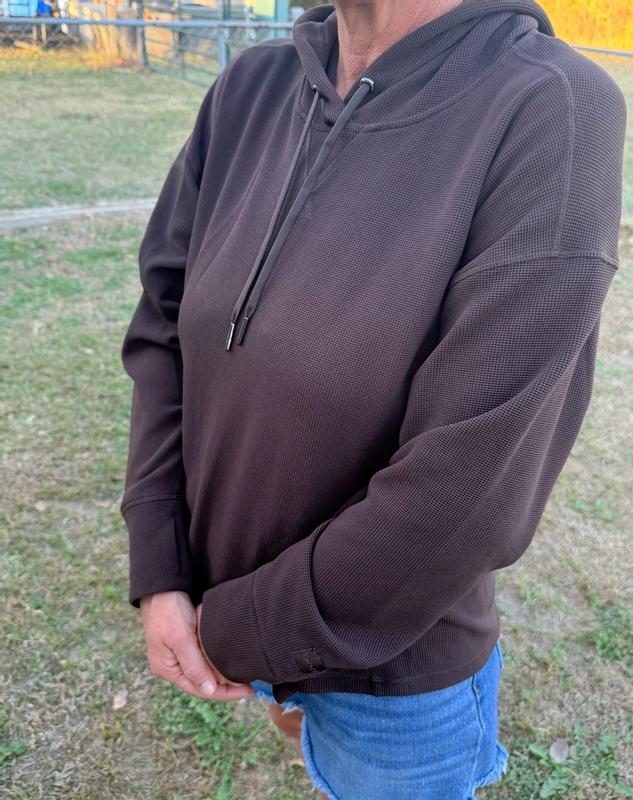 First of all, I love the color of this hoodie. It’s a beautiful brown that is perfect for fall. The hoodie is very comfortable. It’s not too thin but not too thick. It is a stretchy, waffle material that isn’t scratchy. It’s perfect as an athletic or casual hoodie. It has thumb hole slits so the sleeves don’t ride up. The length comes right below my pants waist line (I’m 5’6”). Would recommend this hoodie to others.