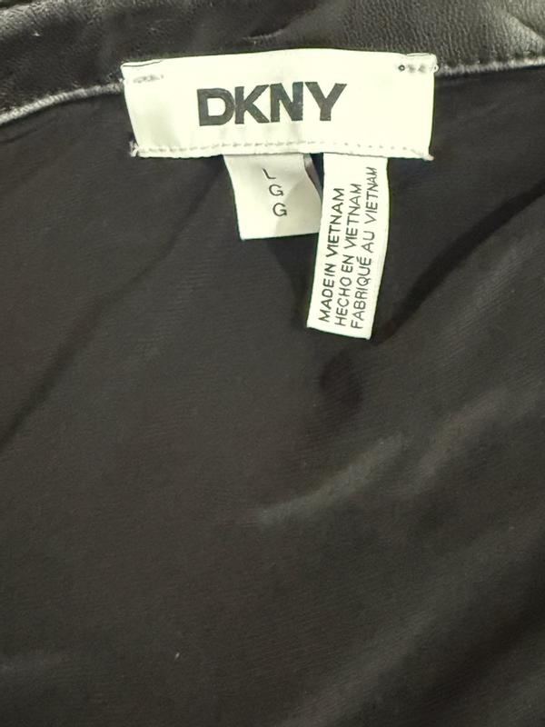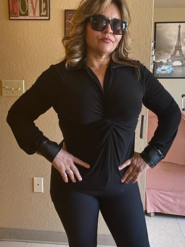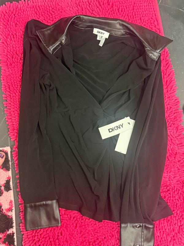 Love this cute DKNY top! It's comfortable and feels high quality, not cheap. The twist front dresses it up. The pleather detail on the neck and cuffs are perfect to add a little edge, but still keep it classy. Goes perfect work blank pants or as seen paired with pleather leggings to match the collar and cuffs!