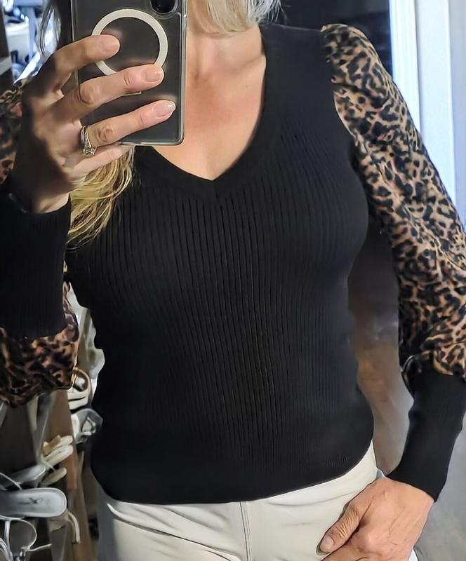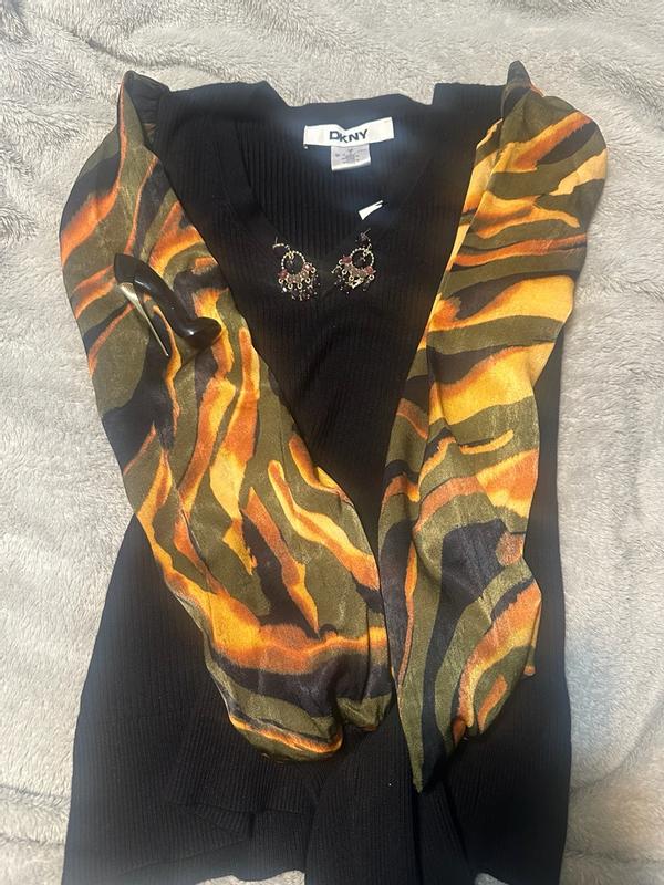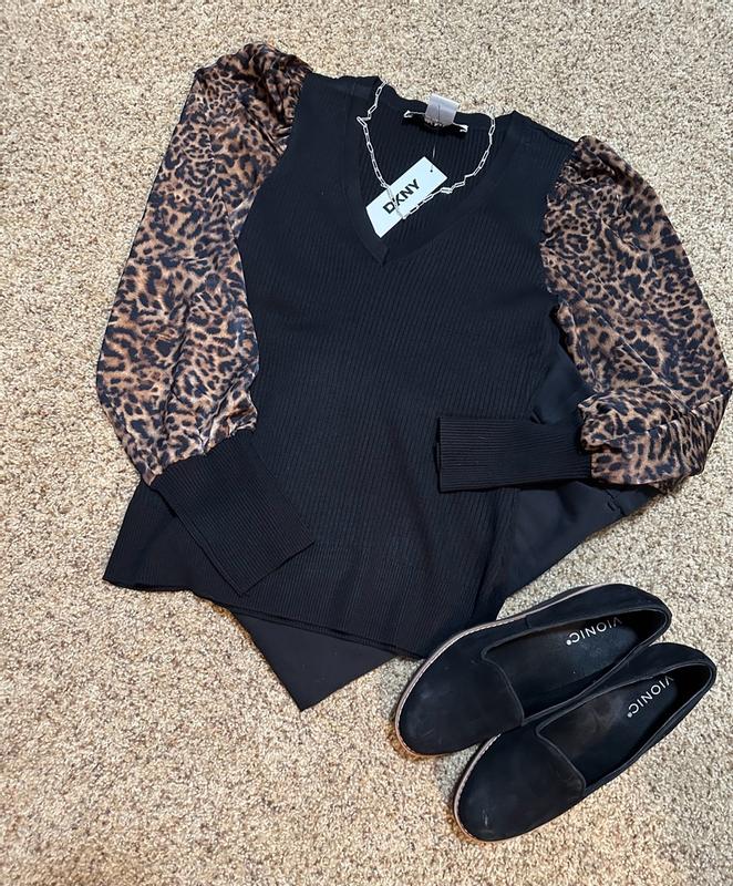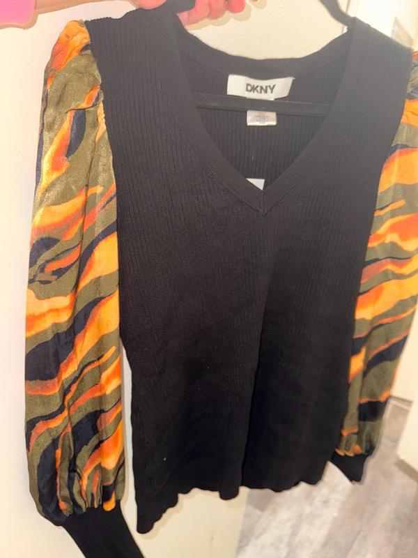 I received this DKNY long sleeve V neck printed supple satin sleeve sweater in exchange for my honest review. I had to say I was skeptical about the puffy sleeves but this sweater is beautiful and super flattering. I absolutely love it. I’m a little curvy in the waist and it is slimming. The material is nice and soft. It’s not cheap material. I paired it with black pants, black jeans and blue jeans and received lots of compliments. I would recommend buying it.