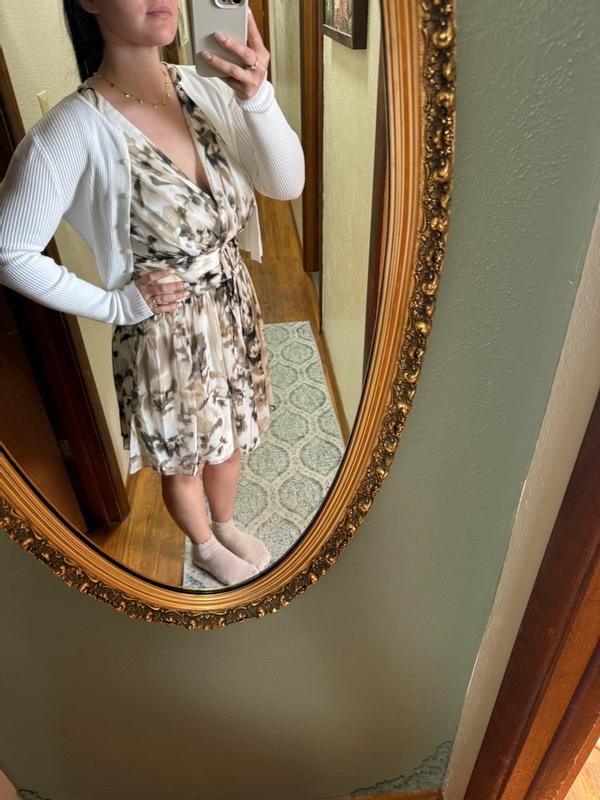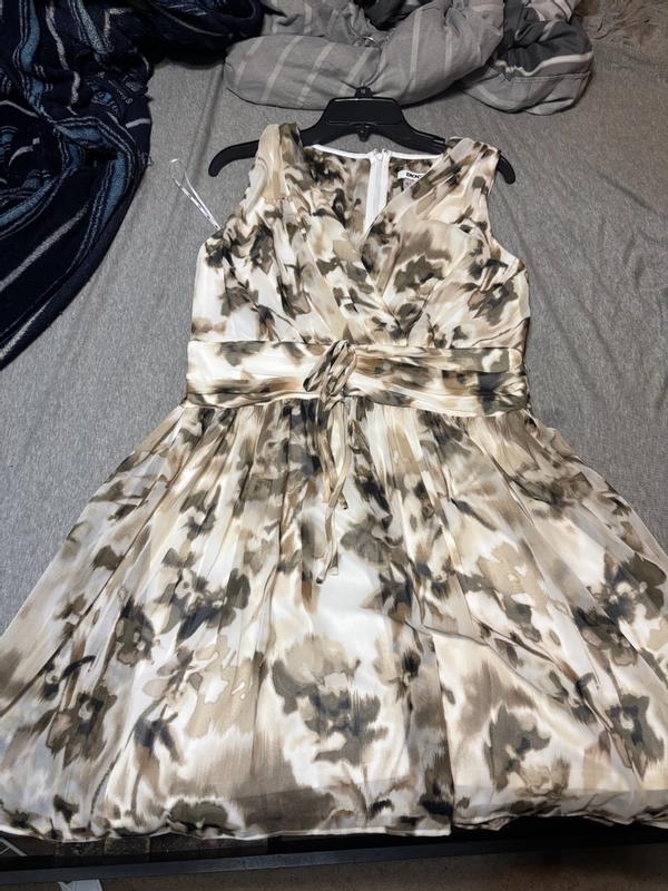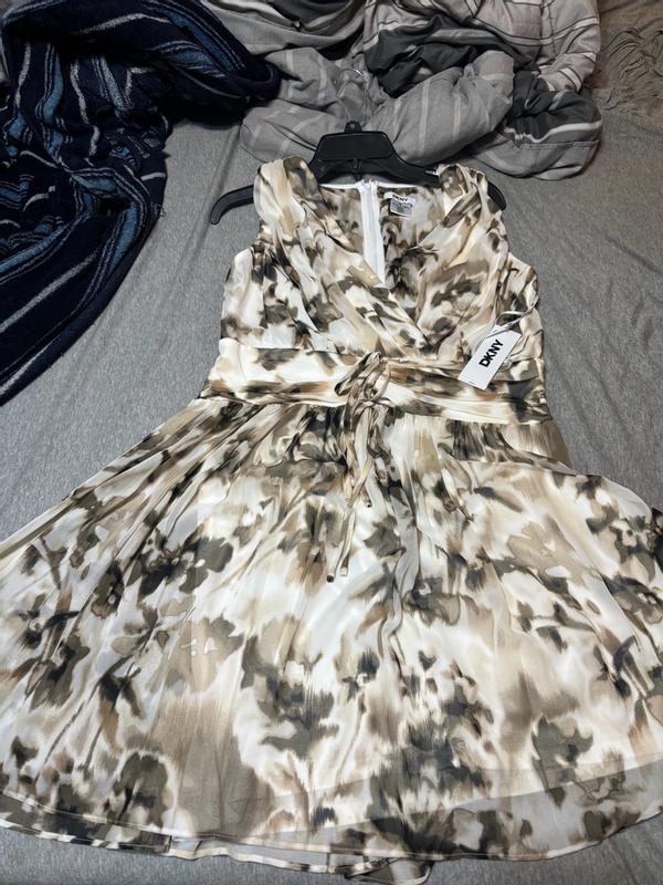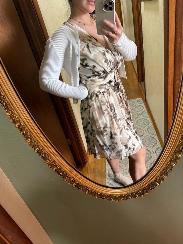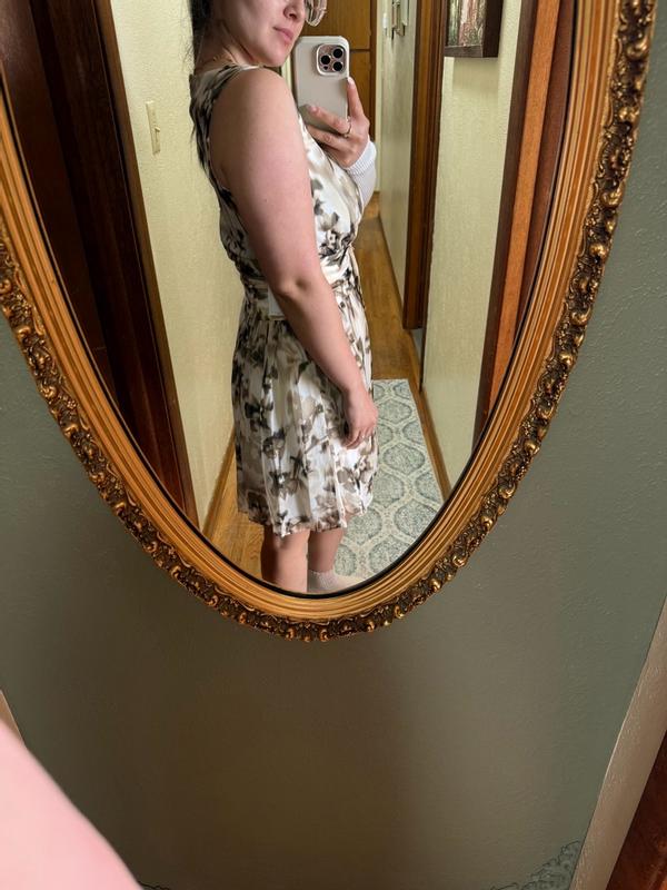 Pleasantly surprised how well this dress fit. It doesn’t look like anything special on the hanger. But on it looks amazing. It’s the perfect length. And gives the body an hour glass look. It’s also true to size. The material is comfortable and looks expensive. The dress is lined so it’s not see through. The colors are beautiful too . A perfect neutral dress great for any skin color. Great dress to wear to dinner, a wedding or any occasion. Can’t wait to wear this one out!
