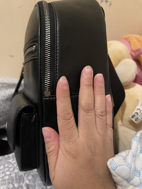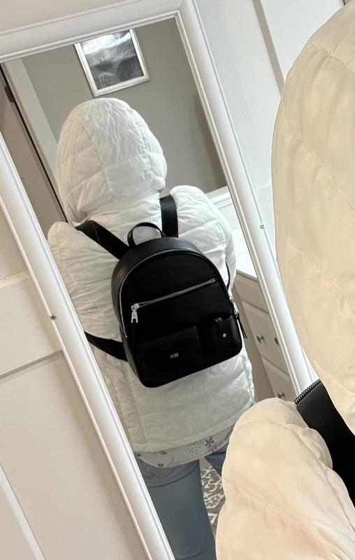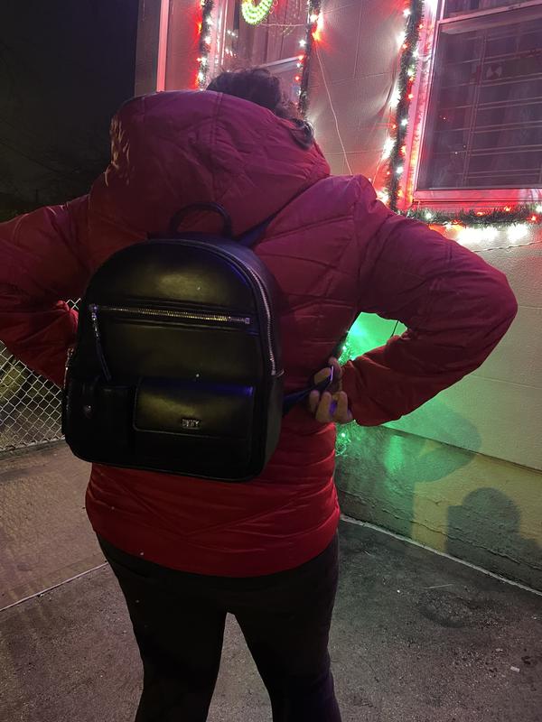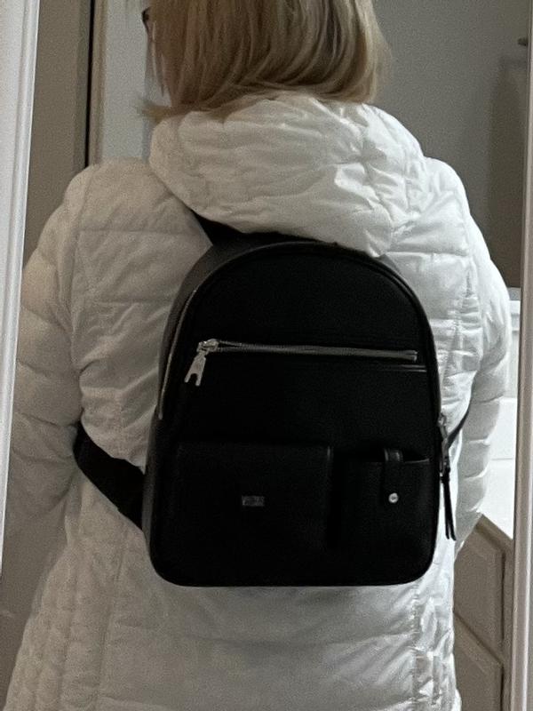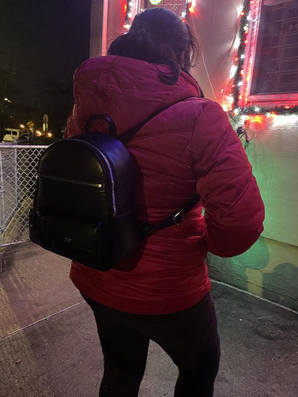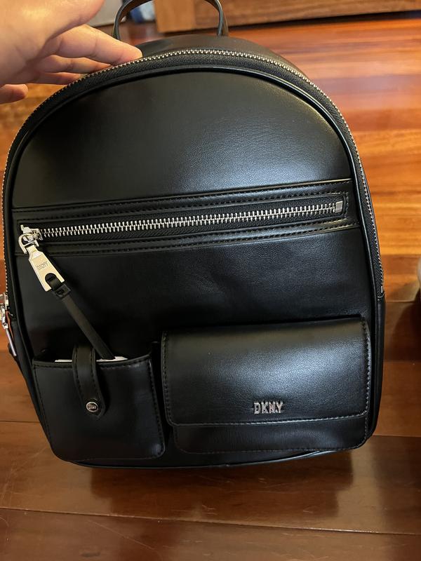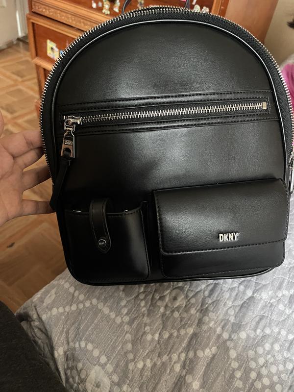 Love this DNKY Womens backpack. It has lots of space and plenty of pockets. 2 good size inside pockets. On the outside of the back also has a slide in pocket. The outside front has 2 small pockets. The zipper and buckles make it stand out. It wears well and stays in place