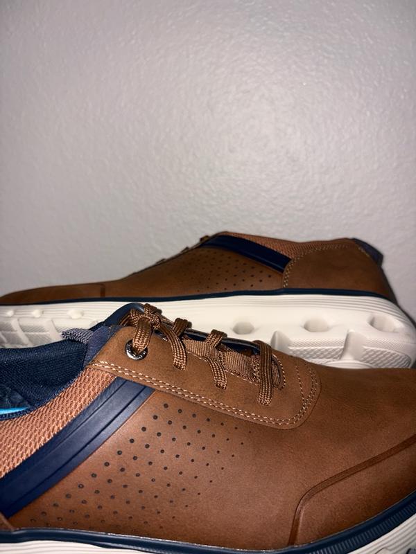 I like how these feel, I got them for work. Super easy to clean and lightweight. For work, I stand for over 7 hours and these shoes have provided support. The brown compliments the navy perfectly, they offer great arch support and I did size up. Also, the rubber support is great and make it both breathable and versatile. I know you could compliment this with a navy suit or dark wash jeans. This goes with so many outfits.
