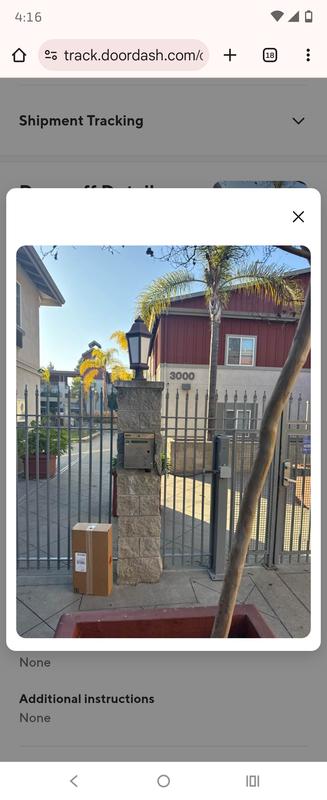 Package was delivered at apartment complex entrance not at my door thankfully I was home and saw my email had to literally run to get it before someone else took it was delivered by DOORDASH never had this issue before
