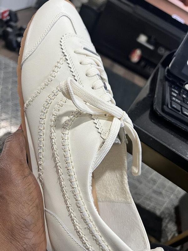 Leather Perfect! I’m on a mission to upgrade my warm weather footwear selections starting with the Delaney slim profile neutral color sneaker that will go with everything. This style is a winner, fits comfortably, the gum sole will provide hours of pain-free walking, and the silver tong was a cool surprise. Most importantly, the shoe will gently adjust given the soft leather. It is a great fashion on-trend look, normally I wear a size 12, but chose the next size up to guarantee max comfort while on vacation tours.