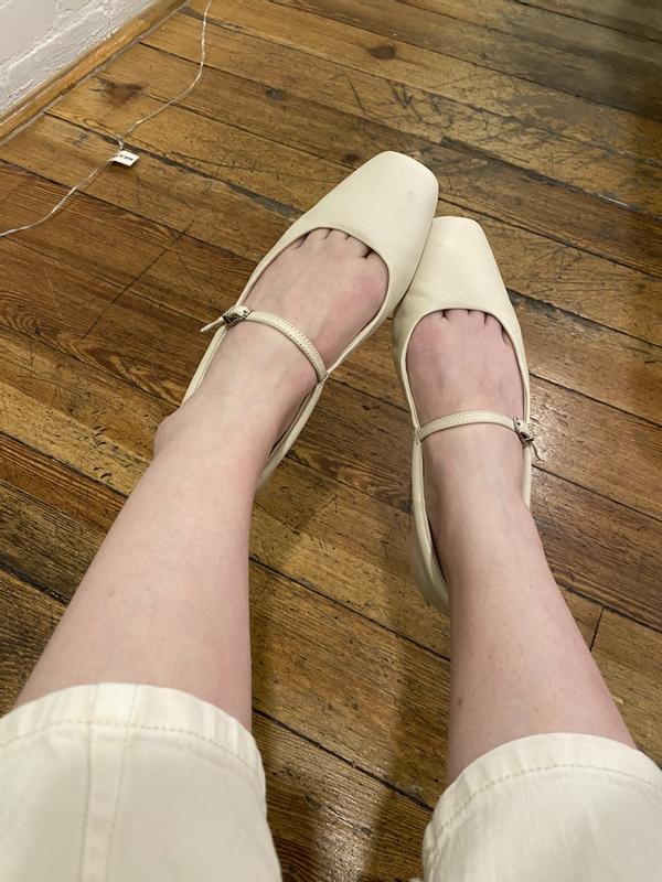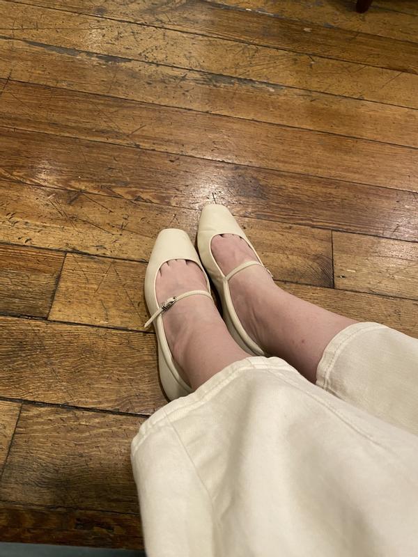 The ivory color is darker than I expected looking at the site pictures, but it's okay. The fit was just a teeny bit tight at first so luckily they stretched out a bit. I ordered my usual size 6. 5 but one foot at its widest is about 9cm across. Any wider than that and I'd say you want to switch to the wide option, at my size (6. 5). I kept it since the wide isn't available in the ivory yet and luckily it ended up working out. There were bits of sticker stuck on the sole still from when they removed the sole guard sticker and a slight mark on the leather.