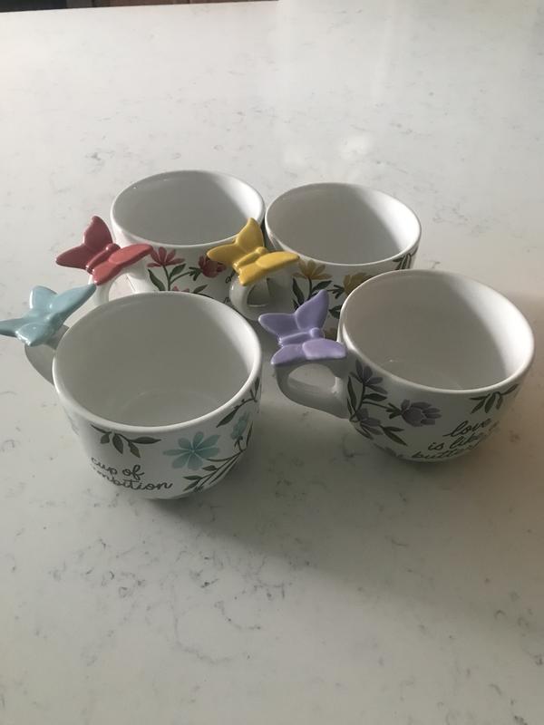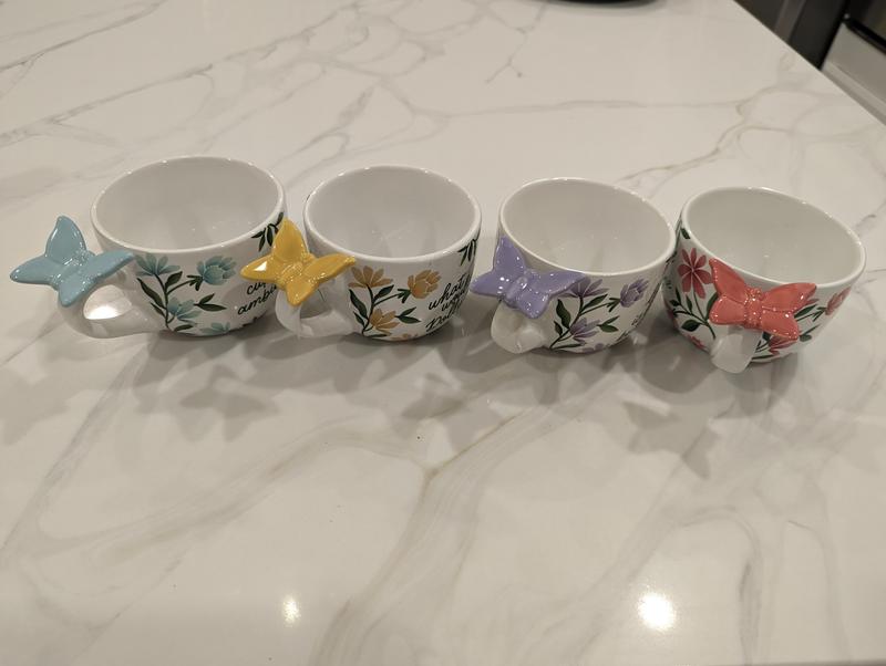I purchased this set for the mug with the purple butterfly for my daughter (who loves the color purple and butterflies). I bought the whole set since you couldn’t purchase just 1. When the set came there was no purple butterfly mug. It came with 2 yellow ones, a blue and a pink mug. It seemed to be a packing error as there was a duplicate yellow where there should have been a purple. There should have been 1 of each color. This was very disappointing and ruined what I thought was the perfect Easter gift.