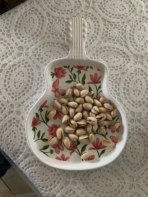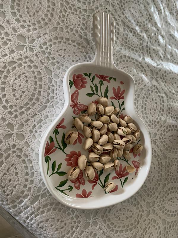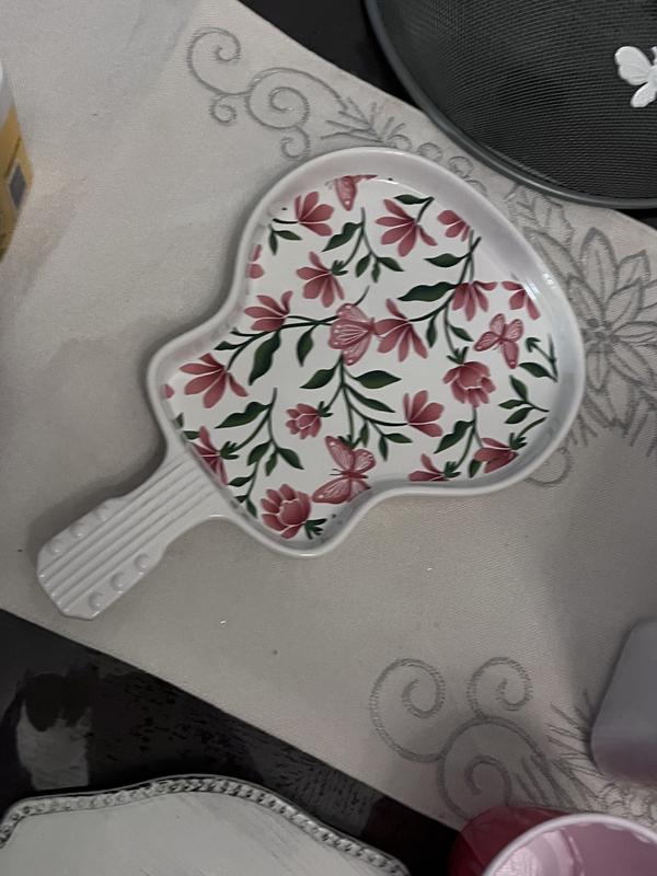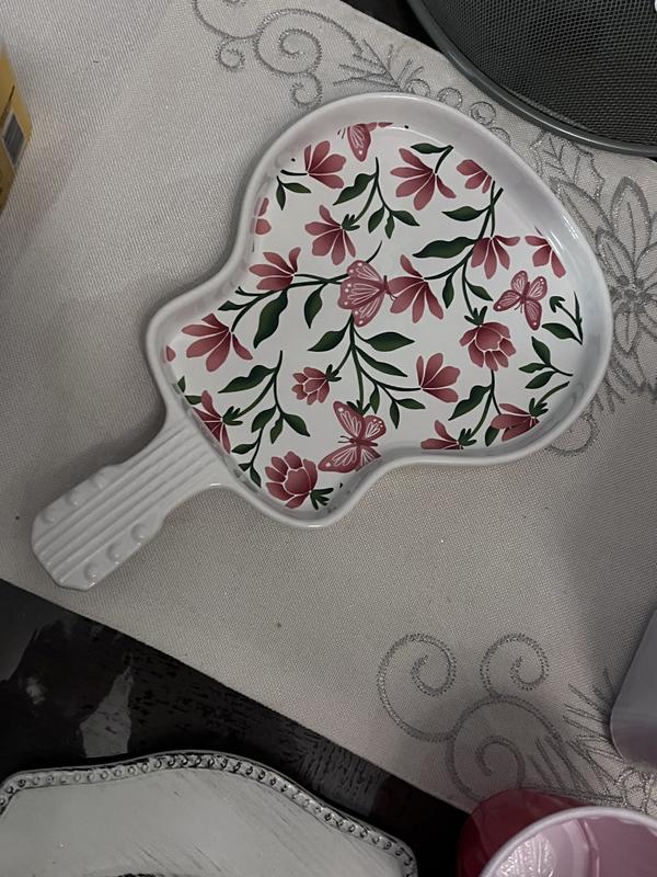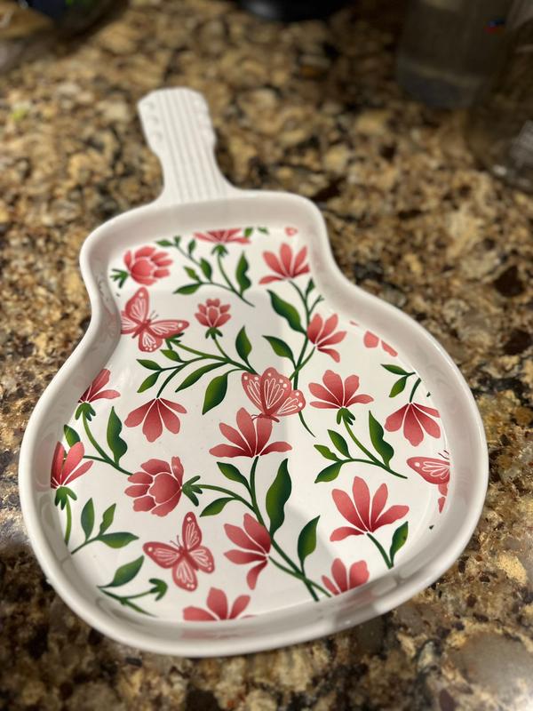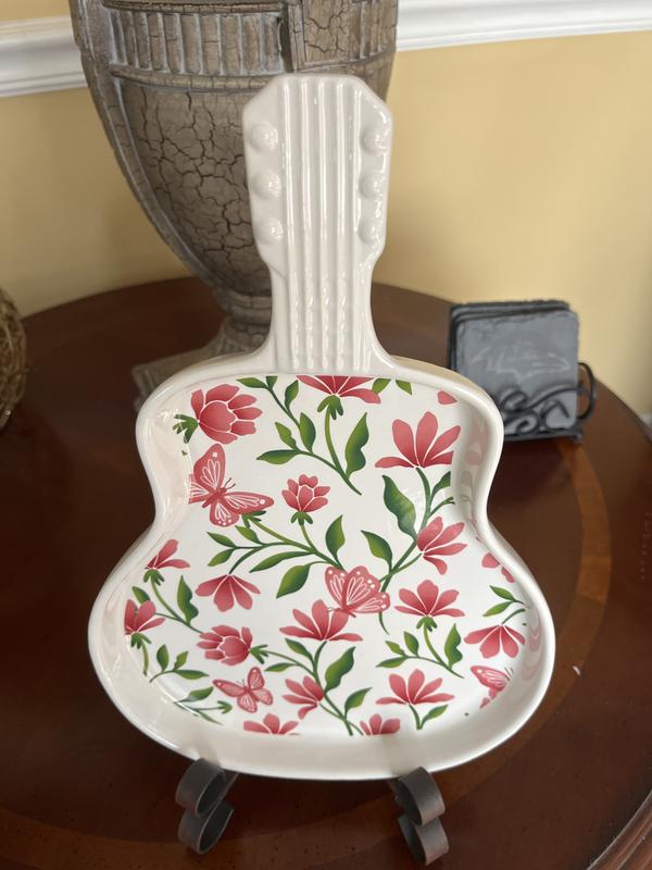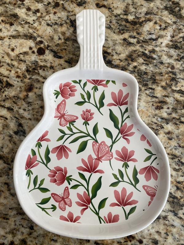 This adorable guitar plate is embellished with pink butterflies and flowers. It's absolutely charming and unique. I am currently using it on my dresser to display some jewelry, but it is definitely a great statement dish to serve small appetizers or snacks on. This guitar plate was given to me as part of a promotion but alll opinions are my own.