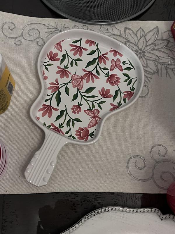 I like this small serving tray. The pattern is very spring like with the pinkish mauve color butterflies flowers and the green stems. It is a very pretty piece more practical for display rather than being used for a dish or serving platter. If it was about double the size I would use it for serving. Since I really don’t have a display case or stand I did use this as a serving tray for some hors d’oeuvres which included some cheese crackers and fruit for a friend that visited. She adored it as well. So I suggest to use this small platter for display but it also can be used for a small charcuterie tray. Enjoy!