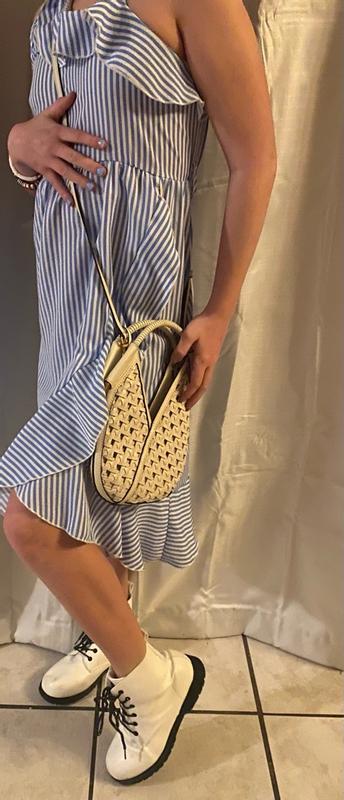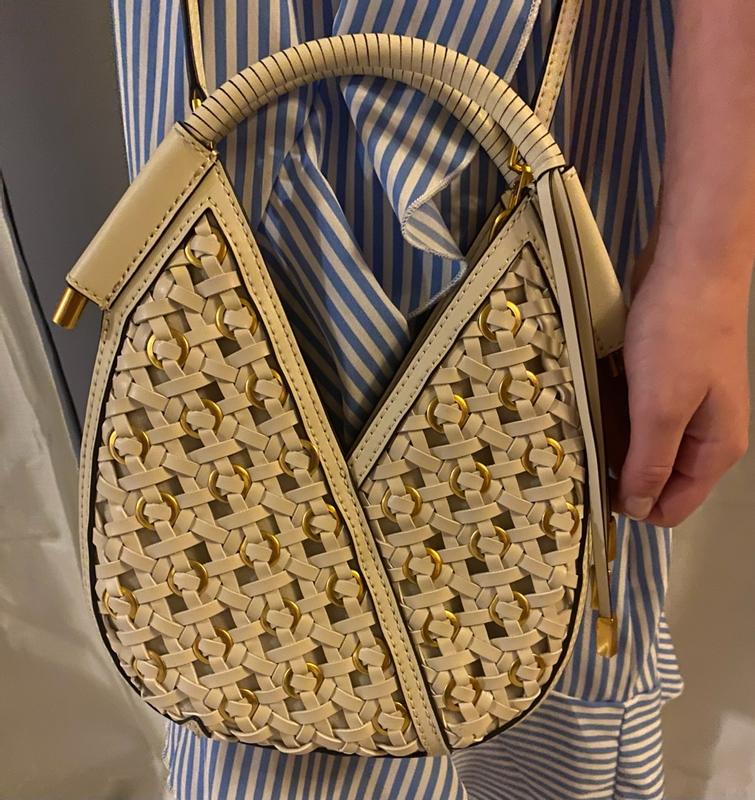 This purse is absolutely gorgeous! The bone color, the weight, the craftsmanship. I adore everything about this "mini" purse. Every golden accent is set just perfectly on one side of the purse, the other is just that beautiful bone color basket weave. The strap is removable, but I preferred to leave it on and tuck it in if needed. The top has a magnetic closure, so keep that in mind while packing. I found that this was perfect when I was out solo and just needed a few necessities. I adore this purse so much, it is different from the larger bags I carry, but I fell in love with this as soon as I got my hands on it! I can't say enough about this purse, it will transition well and I hope to have it in my closet for a very long time :)