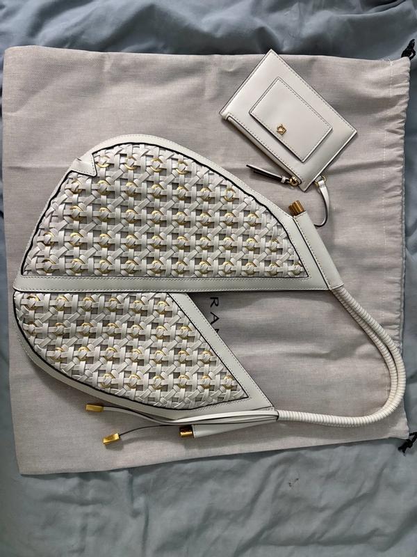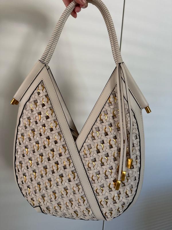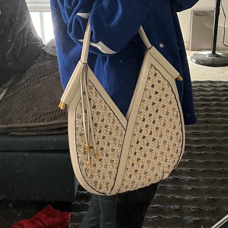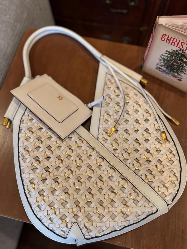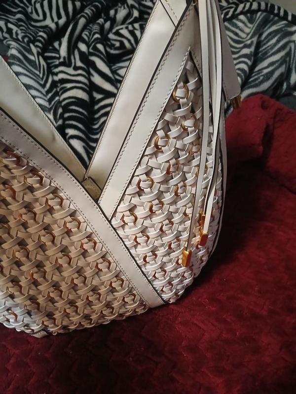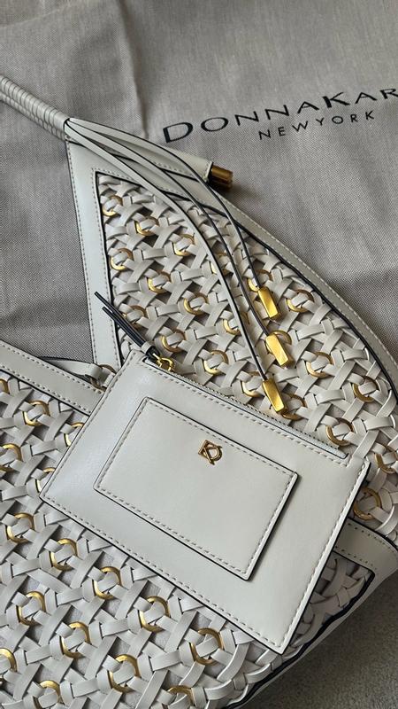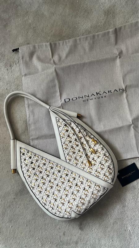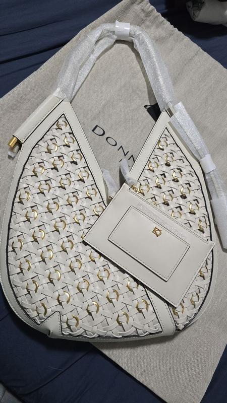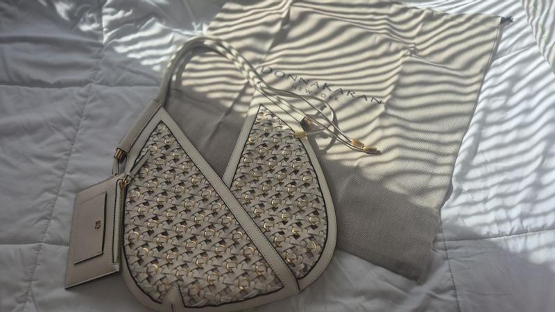 My new Donna Karen purse is stunning! All the little details that have gone into it make it so beautiful. Upon opening, everything had plastic or tissue covering to protect all the little details. Itโs a perfect mid-size bag, allowing you to carry a handful of essentials. Easy to carry on your forearm or shoulder. All gold tone accents on the off white bag look very nice together. The grommets are only on one side keeping the other side plain against your body. Everything is very smooth and sleek feeling, nothing to catch your clothing on. Tassels tips even have gold tone accents, giving it an upscale look. It includes a detachable wallet pouch which is big enough for a maybe a card and a little cash. No inside pockets, but at this size, I donโt find it super necessary. I typically put my items in separate removable pouches anyway. Also included is a sturdy, thick dust cover for safe keeping. I was surprised at this price point that itโs not real leather, Iโd have liked to see it priced lower being faux leather. This is a gorgeous bag for sure, and will make special evenings look the part. I intend on taking good care of this purse, it should last years to come!