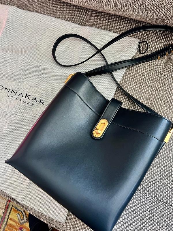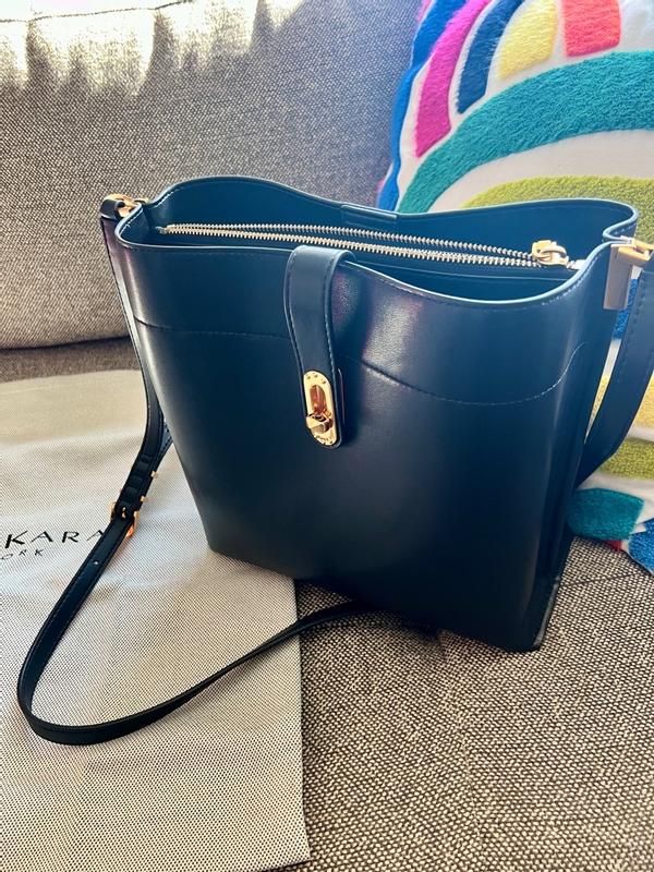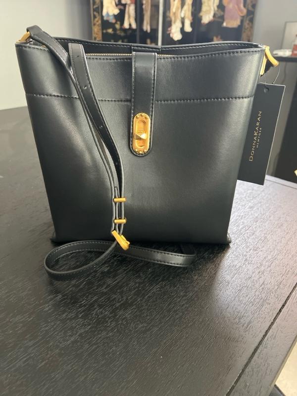 This classic carryall bag from Donna Karan is the perfect option for your daily necessities and more. This minimalist style has a spacious interior, hardware details, and adjustable strap.