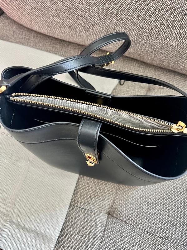• Gold-tone exterior hardware; interior center zip pocket, two open side pockets, zip pocket & slip pocket