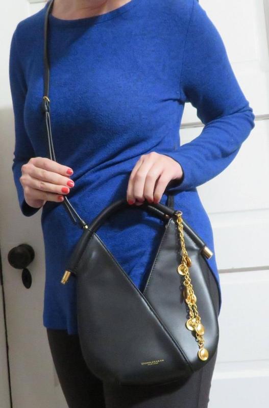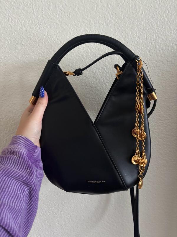 This Donna Karan crossbody bag is so cute. It says micro but if your small like me it doesn't seem tiny. The little gold charms add sparkle. Lots of compliments on the black and gold. The bag can only hold a wallet and set of keys so not much. The straps are adjustable and removable so it can be held as a purse or crossbody. Absolutely adore this bag.