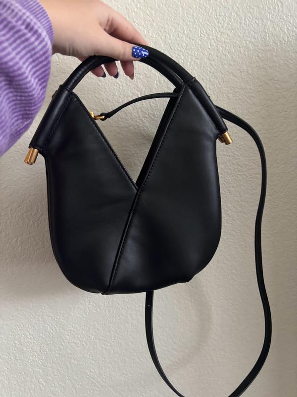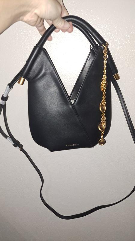 The overall design of this crossbody bag has a unique v-shape with an inner magnetic clasp. It's simple and sophisticated, but it only holds the basics. The strap is removable and works just as well as a handbag. The gold chain is a nice touch but a little loud when wearing the bag. The chain could easily substitute as a necklace!