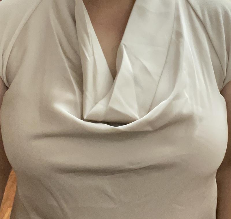 Bought this in the color "tide" wear to a fall wedding with a black leather skirt. The material has a beautiful sheen, and the cowl neck drapes gracefully. It's a very flattering blouse.