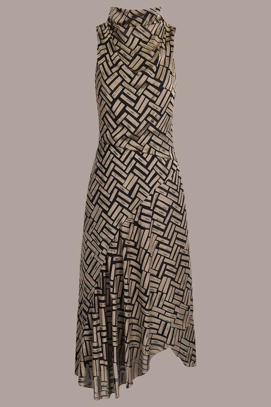 I like the asymmetrical shape of this dress. However, the fabric feels cheap. And the zipper is difficult. It was a bit snug so I didn’t wanna force it and rip the dress. I am 5 foot nine so it is still a nice length. I really like the pattern, but upon closer inspection it almost cheapens it. I would’ve preferred just a regular neck. Or a solid color. It says that it is belted, but it didn’t include a belt. It’s just the stitching of the dress.