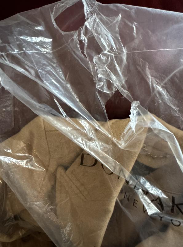 UPS package was in tact, however the bag Macy’s put the coat in was dirty and had a hole on the top of the bag. Ordered XXS The coat fits like a glove, but has huge stitching everywhere. Ruined the coat. only oils included a few pics. Not worth the price.