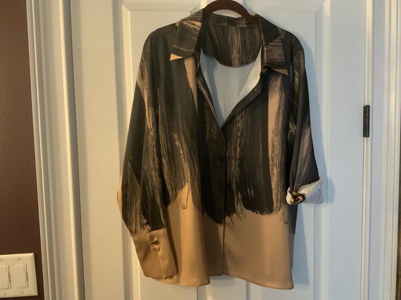 This is a beautiful blouse. Just be aware, the inside of the fabric is white. If you like an open collar or to roll up sleeves, the white shows and detracts from the look.