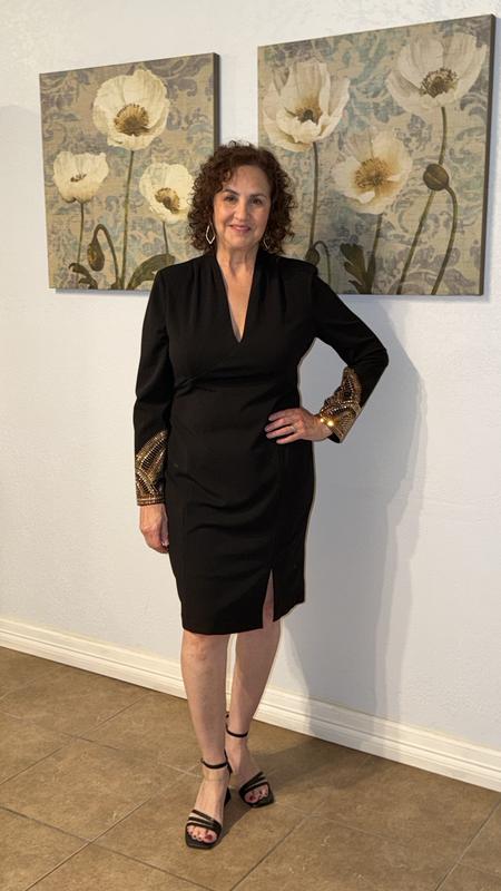 Women's Long-Sleeve V-Neck Hot Fix Sheath Midi Dress