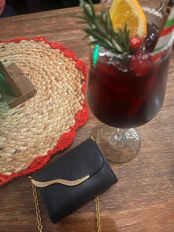 This is the perfect mini wallet! I am a minimalist and try not to take big purses with me, this is compact with a beautiful gold chain to add class! It opens to two moderate sized wallet pockets to fit an ID, credit card and cash, plus a small lip mini! It’s beautiful leather and detail on the front is perfect for an added pop for new years or a night out!