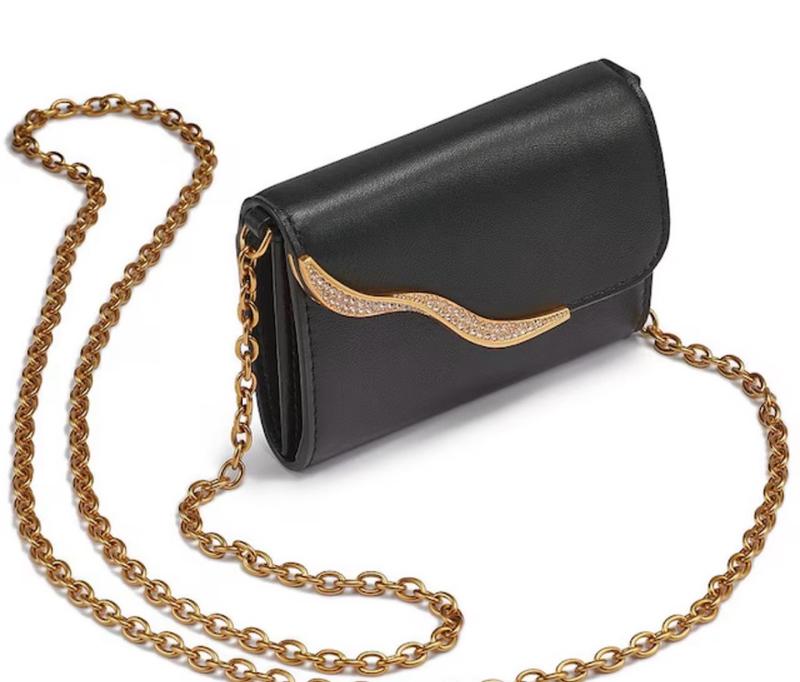 This is a truly beautiful high quality wallet on a chain. The leather is soft and the gold and crystal accents are high quality. My only note is that it is VERY small, so make sure this will work for you! It is literally a wallet size, and it did not fit my iPhone.